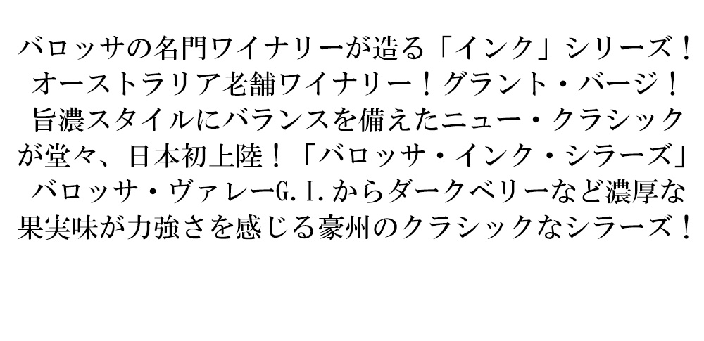 【商品説明】オーストラリア・フルボディ辛口赤ワイン愛好家大注目!バロッサ・シラーズ愛好家大注目!バロッサの名門ワイナリーが造る「インク」シリーズ!旨濃スタイルにバランスを備えた「ニュー・クラシック」が日本初上陸!世界有数の高級ワインの産地として知られる、南オーストラリア・バロッサ・ヴァレー!主にシラーズの産地として有名ですが、フランスの品種など多様な品種が栽培されています! 造り手は、オーストラリア、バロッサ・ヴァレーで1855年から5世代にわたってワイン造りを行う老舗ワイナリー!伝統を重んじながらも革新的な挑戦を続ける同社は各評価誌で高い評価を得ており、ジェームス・ハリデーでは2013年から5 ツ星を獲得!土地への理解とワイン造りの本質的な知識に基づき、多様化するワインマーケットに対しても様々なポートフォリオを生み出しています!また、バロッサ・ヴァレーとイーデン・ヴァレーに畑を所有し、経験豊かな醸造用ブドウの栽培専門家チームと献身的で誠実な栽培農家が共同で運営することで、ブドウの品質は常に最高レベルに維持されています!ずばりバロッサの名門グラント・バージの「インク」シリーズ!2019年ヴィンテージの「バロッサ・インク・シラーズ」は、ワインアプリ「Vivino」で豪州のユーザーが選ぶ25$以下のワインで一位を獲得するなど、高評価!まさにオーストラリアの消費者に最も選ばれたワイン「インク」! 黒色土壌からのシラーズ主体をステンレスタンク発酵、ステンレスタンク9ヶ月(オークス・スティーブを使用)で造られる極旨辛口フルボディ赤ワイン!ダークベリーなど濃厚な果実味が力強さを感じる豪州のクラシックなシラーズ!黒胡椒やクローブのようなスパイスが複雑味を与え、凝縮感のあるワインに仕上がっています!バロッサ・ヴァレーG.I.からの「インク」シラーズが待望の限定入荷!