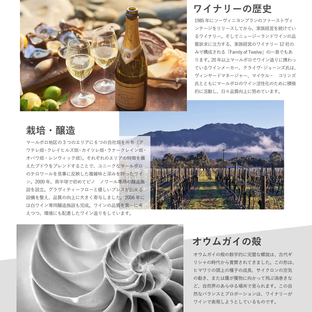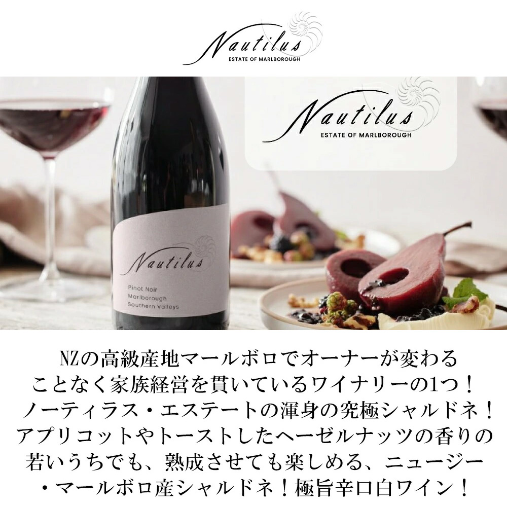 【商品説明】ニュージーランド・マールボロ産辛口白ワイン愛好家大注目!ニュージーランド・ソーヴィニヨン・ブラン種100%辛口白ワインファン大注目!いきいきとしたシトラスのフレーバーが口の中一杯に広がり、滑らかな口当たりの辛口白ワイン! 造り手は1985年にソーヴィニヨン・ブランのファーストヴィンテージをリリース!マールボロでオーナーが変わることなく、家族経営を貫いているワイナリーの1つです(マールボロでは2軒のみ)!2000年には南半球で初めて、ピノ・ノワール専用の醸造施設を設立!グラヴィティー・フローと優しいプレスが出来る設備を整え、品質の向上に寄与しました!2006年には白ワイン専用醸造施設も完成!ワインの品質を第一に考えつつ、環境にも配慮した構造となっています! ワインメーカーClive Jones(クライヴ・ジョーンズ氏)のコメントは「果実は夜か朝の涼しいうちに機械で収穫された。すぐに破砕して圧搾する。果汁はステンレス・タンクで様々なアロマティック酵母で発酵させる。その唯一の目的は、ブドウ畑で育った風味とアロマを反映させ、保存することである。畑で育まれた風味とアロマを反映させ、保存することが唯一の目的である。果汁の5%は非サッカロミセス酵母で発酵させた。1%は樽発酵。発酵、ワインは澱と3ヶ月間接触させた。3ヶ月間澱と接触させる。この古典的な手法により、クリーミーさが増し、風味が統合される。風味を統合する。」 「2024年のノーチラス・ソーヴィニヨン・ブランは、レモングラス、新鮮なカシスの芽、熟したグレープフルーツの力強いアロマを示す。レモングラス、新鮮なカシスの芽、熟したグレープフルーツのアロマ。口に含むと口に含むとライムの皮のような風味が広がり、食欲をそそる。力強いテクスチャーで締めくくられる。」 フードマッチングは「カリカリのフィッシュタコスに、ヨーグルト、ライム、チャイブのピリ辛ソース。等」とともに!「口当たりのある、シリアスな」ソーヴィニヨン・ブランを造るため、大樽の使用、クローンの研究などを実践しています!ノーティラス・エステート・ソーヴィニヨン・ブラン2024は黒スグリの芽、パッションフルーツの凝縮した香り、わずかにイラクサのニュアンス!いきいきとしたライム、シトラスのフレーバーが口の中一杯に広がり、しっかりと、そして滑らかな口当たりが特徴です!