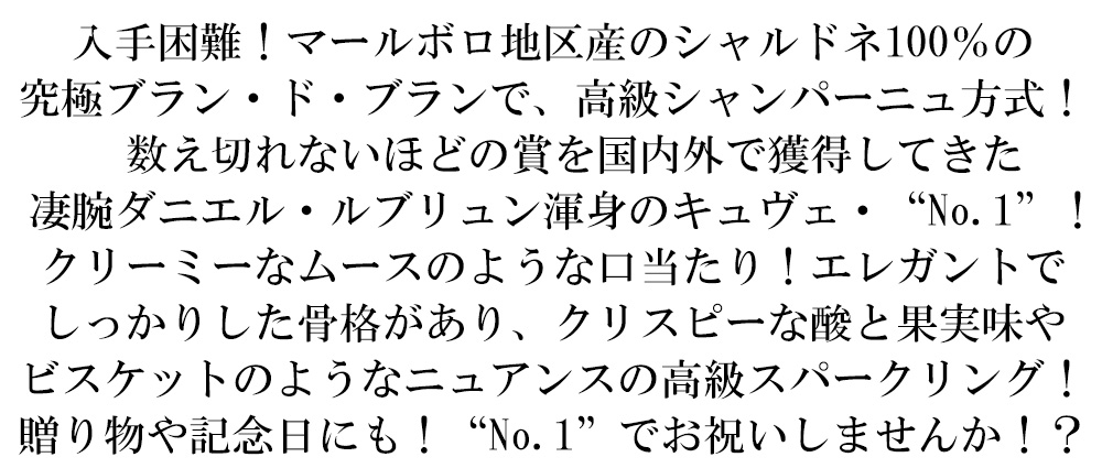 【商品名】ナンバーワン ファミリー エステート キュヴェ “No.1” マールボロ メソッド トラディショナル ニュージーランド マールボロー地区産 NV 【英名】No.1 Family Wstate Cuvee No.1 Marlborough Methode Traditionelle Sparkling Brut (Daniel Le Brun Family=“Adele & Daniel Le Brun”) (97/100 | No.1 Reserve NV | Sam Kim, Wine Orbit & 97/100 | No.1 Reserve NV | Cameron Douglas MS ) 【商品説明】入手困難!大人気ニュージーランド産辛口スパークリングワイン愛好家大注目!ニュージーランドのベンチャー企業によるニュージーランド産メソッド・トラディショナル(高級シャンパン製法の瓶内二次発酵)シャルドネ100%辛口B&B高級スパークリングワイン!しかもマールボロ地区産のシャルドネ100%の究極ブラン・ド・ブランで、高級シャンパーニュ方式(瓶内二次発酵)辛口スパークリングワイン!数え切れないほどの賞を国内外で獲得してきたダニエル・ルブリュン渾身のキュヴェ・“No.1”が遂に登場!しかもシャンパーニュ・ワインライターのトム・スティーブンソンをして『ニュージーランドで最も高品質なスパークリングワインのベンチャー企業であり、全作品がシャンパーニュの品質に匹敵する。』と絶賛コメントを残させたナンバーワン・ファミリー・エステートのキュヴェ・“No.1”!クリーミーなムースのような口当たり!エレガントでしっかりした骨格があり、クリスピーな酸と果実味やビスケットのようなニュアンスの高級シャンパン方式スパークリングワイン!造り手のNo.1エステートワイナリーは、フランス・シャンパーニュ地方で12世代続くシャンパーニュメゾンの家に生まれ育ったDaniel Le Brun(ダニエル・ルブリュン)がマールボロに1997年に設立したスパークリング専門ワイナリー“ナンバーワン・ファミリー・エステート”!ワイナリーについて「マールボロの素晴らしいワイラウ・ヴァレーにある自社畑で栽培されたブドウのみを使用している。通常3月の最適な時期に、葡萄は手摘みで収穫され、葡萄の木で慣れ親しんだ慈愛に満ちた手入れを施し、葡萄の木が傷つくことなくきれいになるようにする。収穫されたブドウは、新鮮さを保つため、すぐに畑に隣接するワイナリーに運ばれる。ダニエルがフランスから輸入したシャンパーニュ・ヴァスランの圧搾機で、房ごと優しくゆっくりと圧搾する。私たちはキュヴェと呼ばれる一番搾り、最高級の果汁のみを使用する。15時間沈殿させた後、フランスのエペルネにあるシャンパーニュ醸造研究所から輸入した酵母を果汁に接種する。ダニエルにとって、シャンパーニュの酵母を南半球に輸入した最初のワインメーカーである。17度に管理された温度で第一発酵が行われている。ブレンドの技術は、シャンパーニュ造りの名人の真の技であり、ダニエルの技術とワイン造りの科学が融合したとき、ちょっとした魔法が生まれる。シャンパーニュの先祖のように、ダニエルはその経験を活かして複数のヴィンテージをブレンドし、特徴的なNo.1ファミリー・エステートのキュヴェ・No.1が誕生しました。」ずばりナンバーワン・ファミリー・エステートの最高峰スパークリングワイン!このナンバーワン・ファミリー・エステート・キュヴェ・“No.1”・マールボロ・メソッド・トラディショナルでキャメロン・ダグラスが驚異の97点で大絶賛!絶賛コメントは『「フルボディ、リッチで複雑、エレガントで力強く、魅力的で洗練されたワイン。このワインを最初に口にした瞬間から、ワインを選んで正解だったと即座に分かると確信している。果実味と深い自溶性の風味、酸味と口当たりがシームレスにリンクしている。グレープフルーツ、白桃、赤リンゴ、ブリオッシュ、全粒粉のパン。完璧なバランス、エレガントで余韻の長い、素晴らしいワインだ。 97点』と大絶賛!故郷のシャンパーニュ地方の伝統製法(瓶内二次発酵)で造られる、果実味と熟成感が抜群のバランスを織りなすエレガントでスタイリッシュな味わいが特徴の高級辛口スパークリングワイン!ワイラウ川流域の砂利を多く含む沖積土壌のブレナム近郊の南北に面した畑からのサステイナブル農法の厳選シャルドネ100%使用!手摘みブドウを全房圧搾したフリーラン果汁を15時間低温静置後、シャンパーニュ酵母を用いて17℃で低温発酵!ブレンドしたワインにリキュール・ド・ティラージュを加えて瓶詰め!最低18ヶ月間以上の瓶内二次発酵!ドサージュ4.24g/Lの本格派辛口の高級スパークリングワイン!リンゴ、蜂蜜、バター、ナッツ、ミネラルの上品で深みある香りに、シャンパーニュに共通するトースト香!きめ細かでクリーミーなコク!エレガントでしっかりした骨格があり、クリスピーな酸と果実味やビスケットのようなニュアンスの複雑味のバランスが非常に素晴らしい!マールボロー地区産高級シャンパーニュ方式辛口スパークリングワインがセンス抜群の高級エチケットで待望入荷! 【タイプ】白・辛口・スパークリング 【生産者】ナンバーワン・ファミリー・エステート (当