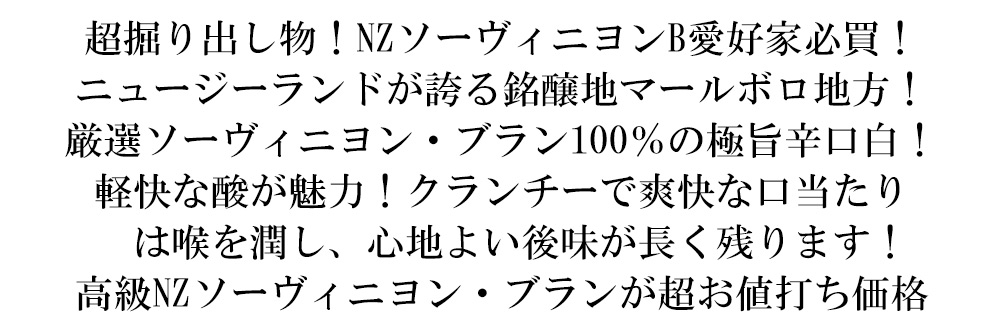 【商品名】ボートシェッド ベイ マールボロ ソーヴィニヨン ブラン 2024 ニュージーランド マールボロ産ソーヴィニヨン ブラン100% 白 辛口750ml 【英名】Boatshed Bay Marlborough Sauvignon Blanc 2024 New Zealand 【商品説明】超掘り出し物!ニュージーランド産ソーヴィニヨン・ブラン愛好家大注目!辛口白ワイン愛好家大注目!ニュージーランド産ソーヴィニヨン・ブランが超お買い得価格で限定で登場!ハーブの香りと溢れんばかりのトロピカルフルーツのすばらしい香り!溌剌として充実した味わいと長い余韻のニュージーランド・ソーヴィニヨン・ブラン!このボートシェッド・ベイブランドはカリフォルニアに本拠地を置く米国のワイン会社、Folely(フォリー)がニュージーランドで始めたワインプロジェクトの一つです!現在、カリフォルニアにとどまらず、数種のニュージーランド産ワインブランドを展開しており、それぞれが高い評価を獲得してます!ワインはマールボロ地区の二つのサブリージョン、沿岸部の冷涼なアワテレ・ヴァレーの鮮度の高いブドウと比較的温暖なボディの強いワイラウ・ヴァレーからブドウを早朝に収穫、別々に醸造しブレンドを行い生み出します!エントリーラインでありながらも、妥協を許さない丁寧な作業が品質を証明しています!サステナブル農法の厳選ソーヴィニヨン・ブランをステンレスタンク醗酵、ステンレスタンク2ヶ月(シュール・リー)熟成で造られる辛口白ワイン!過去V.Tでもリアル・ワイン・ガイド旨安賞の経歴!鮮度の良いグレープフルーツや八朔、白い花、若芝のアロマを持ち、軽快な酸が魅力のソーヴィニヨン・ブラン!クランチーで爽快な口当たりは喉を潤し、心地よい後味が長く残ります!高級マールボロ産のこだわりソーヴィニヨン・ブランが超お値打ち価格で限定で少量入荷!和食をはじめ、シーフード料理全般、チキンサラダ、ゴートチーズ等との相性抜群です! 【タイプ】白・辛口 【生産年】[2024]年 【生産者】ボートシェッド・ベイ (Folely(フォリー)) 【生産地】ニュージーランド/マールボロ(マールバロ)/ ソーヴィニヨン・ブラン100% 【品種/セパージュ アッサンブラージュ】ソーヴィニヨン・ブラン100% 【内容量】750ml 【注意文】4997678138011 【JANコード】1400004002014
