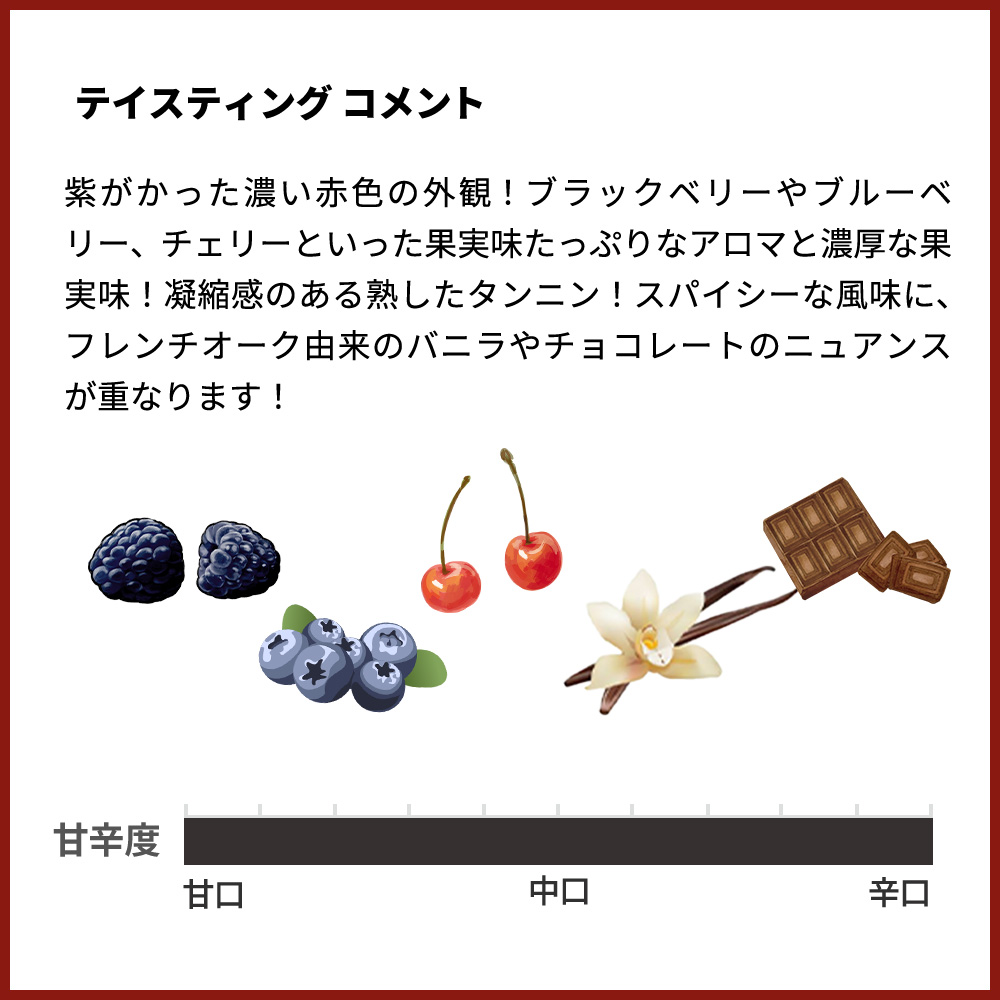 【商品説明】高級オーストラリア辛口フルボディ赤ワイン愛好家大注目!高級オーストラリアカベルネソーヴィニヨン愛好家大注目!ペンフォールズ社といえば、世界最高峰ワインのひとつであり、ボルドーの最高格付ワインと比肩しうるワイン!ペンフォールド社だけでなく全オーストラリアを代表する最高級赤ワイン“グランジ”で有名! 1844年、イギリスから移住してきた医師クリストファー・ローソン・ペンフォールド博士が南オーストラリア州マギルで、妻メアリー夫人と共に医療用として酒精強化ワイン造りを開始したのが、ペンフォールズの始まり!1870年にクリストファー・ローソンが亡くなってから、彼の妻メアリー、義理の息子トーマス・フランシス・ハイランドが跡継ぎとなり、オーストラリア国内のワインマーケットを拡大し続けました!1950年代、消費者の嗜好の変化を反映してスティルワインにフォーカスしたワイン造りへ転向したペンフォールズは、レイ・ベックウィズ博士や、『グランジ』を生み出した初代チーフワインメーカー、マックス・シューバートなどの熱意あふれる偉人たちによって支えられ、格別かつ大胆なワイナリーへと発展!創設から約180年を経たペンフォールズは、比類なき傑出したニューワールドワインとして世界中で認められ、ワイン&スピリッツ誌の『ワイナリー・オブ・ザ・イヤー』を歴代最多の30回受賞するなど多数の受賞歴とともに、世界最高峰のワイナリーの一つとして知られるようになりました! そのグランジ用のブドウが使われるため、“ベビー・グランジ”と呼ばれるのが、このBIN389!1960年に伝説的なワインメーカーのマックス・シューバートによって造られた、このワインは、カベルネ・ソーヴィニヨンとシラーズの豊かさを組み合わせることで、ペンフォールズの名声を確立するのに役立ちました!カベルネ・ソーヴィニヨン57%にシラー43%を、ホッグスヘッド樽を使用し、12~15ヶ月熟成 (樹齢20~40%) で、しかも一部はグランジの前ヴィンテージで使われた樽を使用! この2021年のBIN (ビン) 389で、ワインアドヴォケイト驚異93+点でコメントは「2021年のビン389カベルネ・シラーズは、クリーミーで濃密な味わい(詰まっている!)で、アメリカン・オークがアロマ的にも口中でもワインの中核をなしている。果実はマクラーレン、クナワラ、バロッサ・ヴァレー、ラットンブリー、パッドサウェイのもので、カベルネ・ソーヴィニヨン53%、シラーズ47%。冷涼な季節はワインにフレッシュさと軽快さを与えたが、試飲前に聞かれたら、ビン389に軽快さを与えるのは不可能だと答えただろう!しかし、その通りだ。壮大な凝縮感、存在感のあるオーク。時間をかけて。私は過去に30年熟成のBin 389を試飲したことがあるが、それはまだ生きていて新鮮だった。だから、このヴィンテージはセラーが適している。アルコール度数14.5%。」! ジェームス・サックリング94点でコメントは「いわゆる「ミニ・グランジ」。とろけるようなラズベリー、ブルーベリー、茶葉、アニスの芯のあるしっかりとした味わい。まさにオーストラリア的だ。私はこのワインの古いヴィンテージを飲んだことがある。それは必然的に実りある経験だ。たっぷりとしたオークの骨格は、このワインの潜在的なポテンシャルにふさわしい。今すぐ飲めるが、2027年からがベスト。」! ワインスペクテーター94点でコメントは「ダークチョコレート、ブラックウォールナッツリキュール、モカ、チョコレートで覆われたマラスキーノチェリーの風味が、ふくよかな骨格の上にたっぷりと滲み出ている。燻したパロ・サント、タバコの葉、ブラック・オリーブ、ベーキング・スパイスのアクセントが長く表情豊かなフィニッシュに残る。カベルネ・ソーヴィニヨンとシラーズ。2037年まで飲める。」! 紫がかった濃い赤色の外観!ブラックベリーやブルーベリー、チェリーといった果実味たっぷりなアロマと濃厚な果実味!凝縮感のある熟したタンニン!スパイシーな風味に、フレンチオーク由来のバニラやチョコレートのニュアンスが重なります!タンニンは柔らかくバランスが取れており、力強くも丸みのある味わいを生み出している、まさにグランジのスタイルを引き継いだ究極フルボディ辛口赤ワインが高評価ヴィンテージ[2021]年で正規品で限定少量入荷!