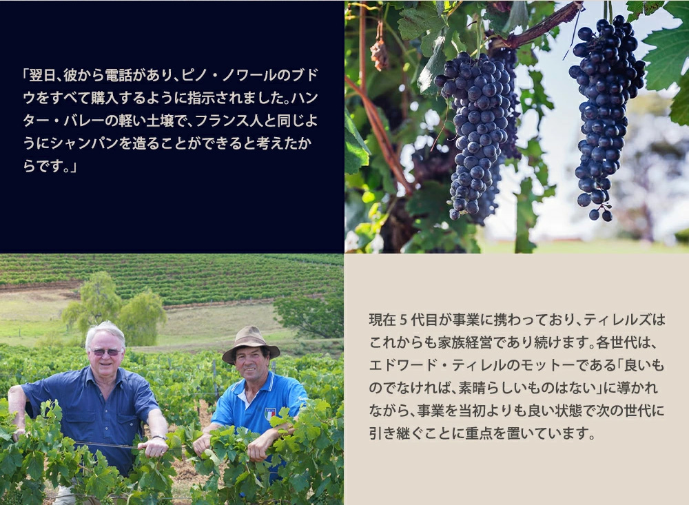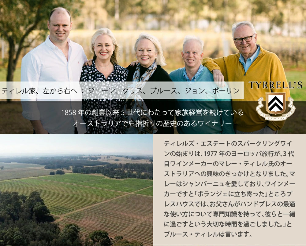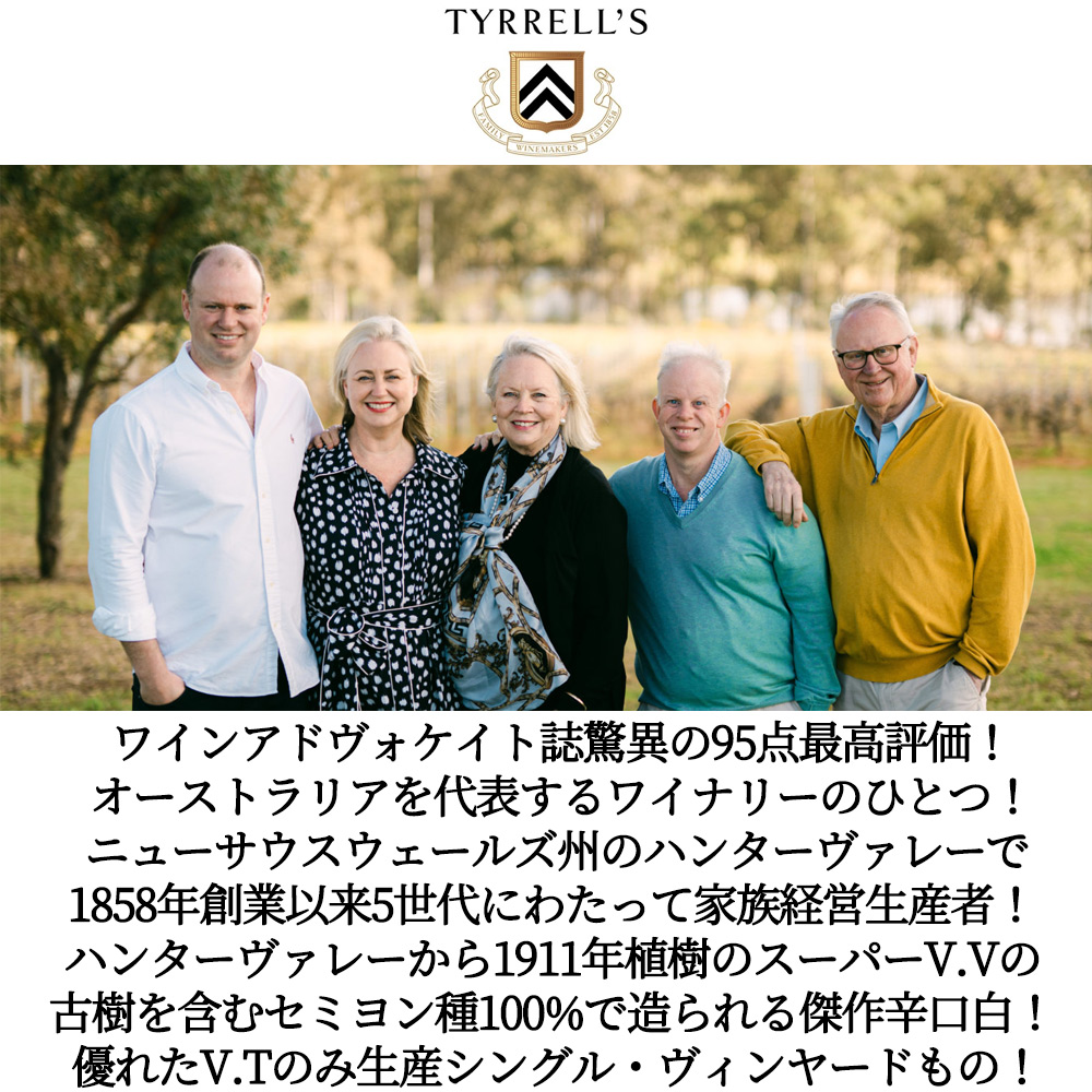 【商品説明】オーストラリア辛口白ワイン愛好家大注目!ニューサウスウェールズ州のハンターヴァレーから1911年植樹のスーパーV.Vの古樹を含むセミヨン種100%辛口白ワイン愛好家大注目! しかも優れたヴィンテージのみ生産される、このティレルズ・シングル・ヴィンヤード・スティーブンス・ハンター・ヴァレー・セミヨン[2017]年でワインアドヴォケイト過去指折りの驚異の95点でコメントは「この2017年のスティーブンス・セミヨンは、私の前にある2017年のトリオの3本目であり、ベストは最後まで取っておいたというのは異論があるだろう。しかしこれは口いっぱいに広がり、包み込むような味わいだ。果実味は中間の味わいから溢れ出し、長いフィニッシュにかけて流れ出す。香ばしくリッチで、サンダルウッド、木の削りかす(ここではオークではなく、削った/砂をかけた木材の新鮮な香りについてのコメント)、新鮮な海の空気、青リンゴ、レモングラス、砕いた貝殻が重なる。このワインは他のワインとはまったく違っていて、スリルがある。このレポートのテイスティングに含まれたのは、ヴァット1のセミヨンの垂直熟成:2022年~1998年。すべてのボトルはスクリューキャップで密封されており(魔法のような)、そのため原始的な状態だった。年月の経過の美しさは、輝かしい瓶熟成の複雑さを示し、これらのワインが年月を経てもなお、果てしなく続いていくことを強く示している。この特別な熟成の弧の威厳は誇張しすぎることはない。」と大注目! 造り手のティレルズはオーストラリアを代表するワイナリーのひとつで、ニューサウスウェールズ州のハンターヴァレーで1858年の創業以来5世代にわたって家族経営を続けている、大変歴史のあるワイナリーです!現在は、ハンターヴァレーの中でも最上のワインを産するポコルビン・ヴィンヤードを中心に、ヴィクトリア州のヒースコートなどに132haの畑を所有し、世界30カ国以上に輸出しています!ジェームス・ハリデーの最高評価である5つ星を初年から毎年獲得している有力な造り手です!2009年以降、サステイナブルなワイン造りにも努力し、2020年からオーストラリアワイン業界独自のプログラム、「Sustainable Winegrowing Australia」にも参加しています!このワインはスティーブンス家所有のグレンオークの畑 (ワイナリーの南に位置する約10ha。砂と赤い粘土の土壌) のセミヨン種100% (1911年植樹の超古木を含む) を1月下旬-2月上旬の早朝に収穫!軽く圧搾後、低温でステンレスタンクにて発酵&熟成!フレッシュ感を保つために短い期間のみ澱と共に熟成!6月にボトリング! 優れたヴィンテージのみ生産される、豊かなゴールドがかったパールグリーン色!ライムやシトラスの様なアロマを持ち、はちみつやトースティーな味わいでミネラル感も有り、口当たりはソフトで柔らかい人気辛口白ワイン!が限定で少量入荷!