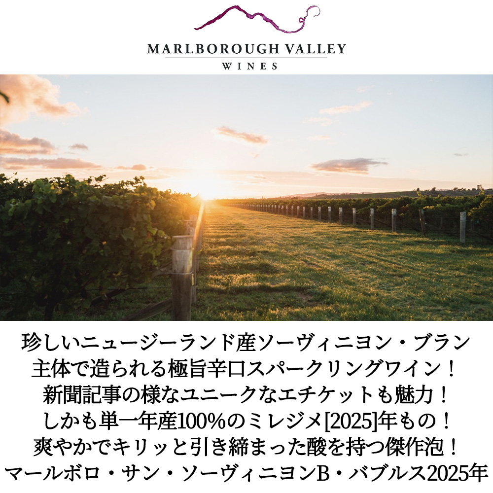 【商品説明】高級辛口スパークリングワイン愛好家大注目!珍しいニュージーランド産ソーヴィニヨン・ブラン主体で造られる極旨辛口スパークリングワイン!新聞記事の様なユニークなラベルも魅力! インポーターさんは造り手について「ニュージーランドの代表的なワイン産地であるマールボロに拠点を置くマールボロ・ヴァレー・ワインズ。マールボロ地区の気候と土壌環境が表現され、持続可能な農業・ワイン造りをモットーに、高品質なブドウを育てワイン造りを行っています。「マールボロ・サン」はマールボロ・ヴァレー・ワインズが手掛ける新聞記事をモチーフにしたユニークなラベルで展開する人気シリーズです。1986年以降マールボロ産のソーヴィニヨン・ブランは新たなソーヴィニヨン・ブランの形として国際的な注目を集め、旧世界が支流であったソーヴィニヨン・ブランのスタイルに大きな影響を与えるようになります。この話題は業界内だけでなく、ワイン愛好家の中でも一大ニュースとして世界中に広がっていきました。「マールボロ・サン」シリーズは、こうした歴史的背景も感じさせることのできるユニークな「新聞記事」を想わせるラベルデザインを使用し、今日のマールボロ産ワインの魅力をラベルを通して発信しています。メーガン氏は20年以上のワイン造りの経験を持つニュージーランドを代表する醸造家としてマールボロ・ヴァレー・ワインズの醸造チームを率いてきました。故郷マールボロでのワイン造りに情熱を注ぎ「全ての人に楽しんでもらうため、優れたワインを一貫性をもって生産する事」をモットーに醸造チームを指導し、自らもその一員として渾身的にワインに向き合い良質なワインを生み出しています。」! 「マールボロ・サン」シリーズのラベルは新聞記事がモチーフになっており、ワインの魅力を記事と写真にして伝えています!ソーヴィニヨン・ブラン・バブルスは以下のように紹介されています!『ニュージーランドのマールボロ地域は最も長い日照時間に恵まれ、素晴らしいワインを生み出しています。今年のヴィンテージも例外ではありません。しかし、太陽の照射熱と今年のソーヴィニヨン・ブラン・バブルスは、マールボロの住民に興味深い行動をもたらすかもしれません。陽気な気分にさせてくれるこのワインの愛飲家の多くは、朝の浜辺でのランニング中にある変化を感じました。浅瀬の水で身体を冷やし、水滴(泡)がさっとかかるのを感じて脱ぎたくなる衝動に駆られたのです。ある地元の少年は、そのランニング中の人々の中に彼の小学校の先生を見つけ、驚いてこの写真を撮りました。あなたが庭で冷えたソーヴィニヨン・ブラン・バブルスを楽しむとき、マールボロの太陽を愛するヌードランナーに乾杯しましょう。あなたもきっと彼らに加わりたくなるに違いありません。』 このマールボロ・サン・ソーヴィニヨン・ブラン・バブルス[2025]年は、マールボロG.I.のサステナブル農法のソーヴィニヨン・ブラン種主体で造られる辛口スパークリングワイン!しかも単一年産100%の[2025]年もの!ヴィーガン認証!爽やかでキリッと引き締まった酸を持つスパークリングワイン!パッションフルーツやレモンの皮、グアバの香りが放ち、新鮮なライチや青リンゴ、柑橘類の刺激的な風味が魅力の1本!珍しいニュージーランド産ソーヴィニヨン・ブラン主体で造られる極旨辛口スパークリングワインが限定で少量入荷!