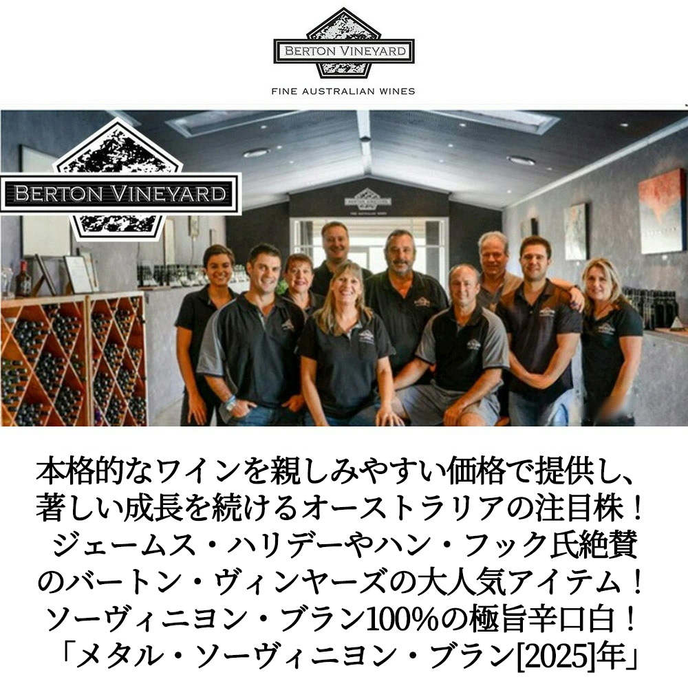 【商品説明】オーストラリア辛口白ワイン愛好家大注目!オーストラリア・ソーヴィニヨン・ブランファン大注目! 本格的なワインを親しみやすい価格で提供し、成長を続けるオーストラリアの注目株!“絶えず思考し革新を目指す”国民性を持つオーストラリア!バートン・ヴィンヤーズではこの素晴らしい国で培われた、優れたブドウ栽培実績を更に際立たせるような、エキサイティングで多彩なワインを産み出してきました! 造り手は、1996年創立者であるボブ・バートン氏とチャーリー・バートン氏が南オーストラリア州バロッサヴァレーのサブリジョンであるハイ・エデンの一区画の畑を購入したことから始まり、2005年にはシドニーの南西、ニューサウスウェールズ州イェンダの地で「バートン・ヴィンヤーズ」を設立 (ハイ・エデンに45エーカーの自社畑を所有) !現在ではオーストラリア20大ワイナリーの一つに数えられ、ブランド売り上げではTop17に名を連ねるまでに急成長!2013年版ジェームス・ハリデーで4.5つ星評価を獲得!オーストラリアで最も影響力を持つ評論家の一人、ハン・フック氏も絶賛!のバートン・ヴィンヤーズによる厳選ソーヴィニヨン・ブラン100%をステンレスタンク (スキンコンタクト有り、マロラクティック醗酵) 、ステンレスタンクで6ヶ月熟成で造られる極旨辛口白ワイン! ライムやグースベリー、熟したパプリカのアロマを持ち、クリスピーなライム、パッションフルーツなどの清々しい果実味とライムの皮のような苦味、長い余韻を持つ1本!メタル調ラベルも人気のメタル・ソーヴィニヨン・ブランが待望入荷!