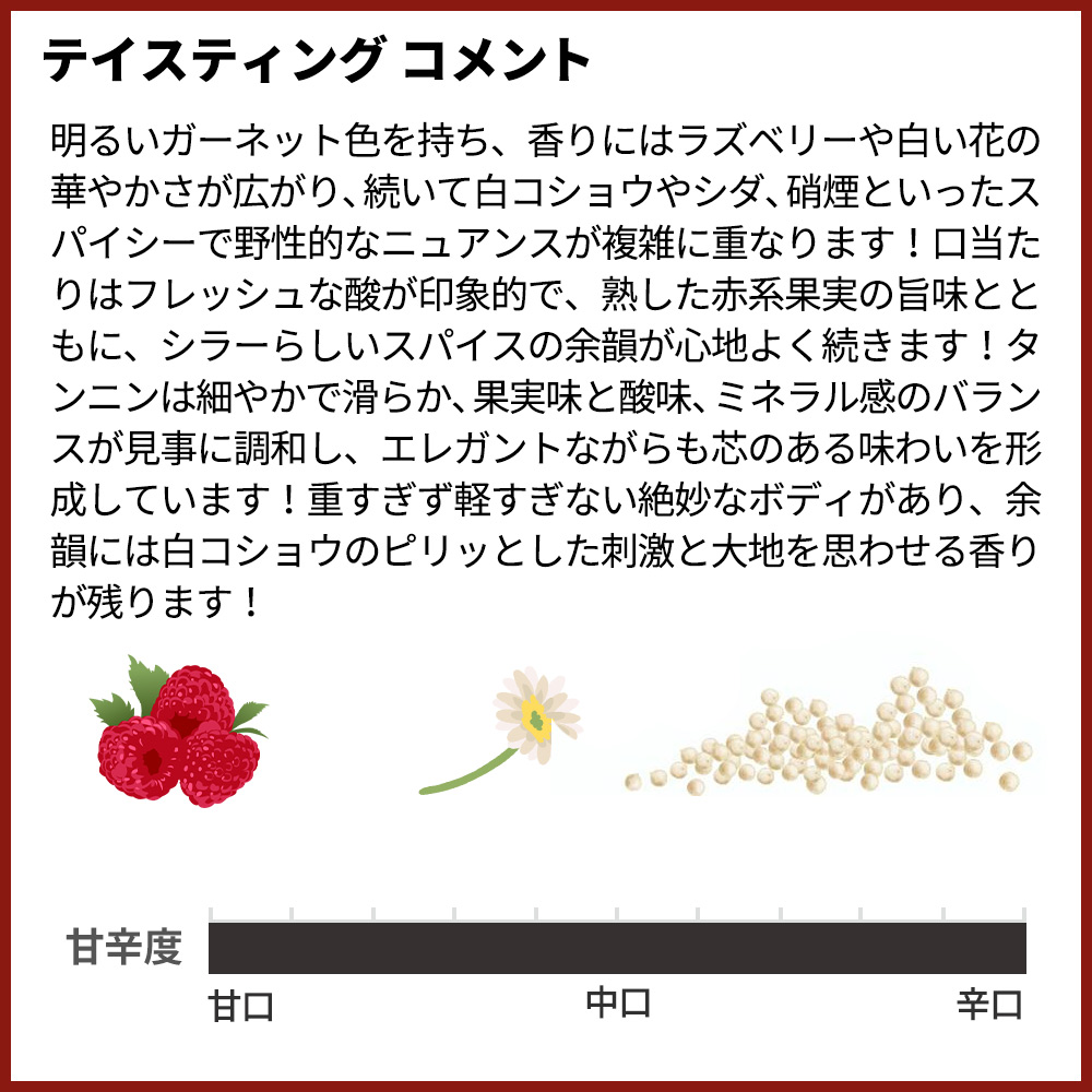 【商品説明】入手困難!ニュージーランドワイン愛好家垂涎!高級シラー愛好家垂涎! 年産903本の超レアアイテム!手にする事ができるのは世界でも一握りの愛好家のみ! 採算度外視で生み出される究極のNZ産“モンスターワイン”『セダリオン』! 「センス・オブ・プレイス」土地の個性を追求した天才醸造家でMWサム・ハロップ氏が造る至極のワイン! 造り手のサム・ハロップについてインポーターさんは「2003年に超難関とされるマスター・オブ・ワインの試飲と理論の試験を最優秀成績で一発合格し、当時31歳という若さで最年少マスター・オブ・ワインとなったサム・ハロップ氏。世界各国で修業を積み、2013年にその人並外れた感性とマスター・オブワインの知識や醸造家として経験の全てを注ぐ自身のブランド「サム・ハロップ」を設立しました。「サム・ハロップ」ブランドの商品ラインナップはニュージーランド北島、オークランド近郊の島、ワイヘケ島で造るフラグシップ「セダリオン」シリーズ、そして同じく北島で造るホークス・ベイ産「グランド・アマチュア」シリーズ、フィアーノ種から造る「ブリッジ・パ」から成ります。健康でその土地を最大限に反映するワインを生み出す為には”ワイン造りは人的介入をしないのではなく、ワイン造りの全ての工程においてコントロールする事が重要である”と唱えます。この考え方をハロップ氏は「シンパセティック・ワインメイキング」と呼び、自身のワイン造りの基軸にしています。例えば天然酵母で醗酵を促しますが、ある時点で厳選酵母を添加しワインの健全な醗酵を促進させ、その土地が生み出す真のブドウのキャラクターを削ぐことなくワインに反映させます。ブドウ栽培から出荷まで全ての工程において一切の妥協を許さず、出荷前にラベルの点検も自らが行う程です。サム・ハロップ氏の造り出すワインはどれもアルコールは控えめで、正確性に優れ見事なテクスチャーと果実味を持ち合わせています。正に、ニュージーランドを代表するプレミアムワインと言えるでしょう。ワイン業界で様々な仕事を手掛けてきたハロップ氏ですが、そのアプローチ方法はワインへの愛と知識を通して人々を繋げたり、他者に影響を与える事だと言います。この20年間、各国のワイン業界における高い才能と豊富な知識を持った人々(小売店、ワイン研究者、情熱的な醸造家や熱心な愛好家に至る)と働くチャンスを享受し、これらの経験がワインに対する姿勢や人生そのものに対する哲学「常識へのチャレンジ精神」を形成させました。2013年ハロップ氏はワインに関するアートや科学を教え続けてくれた’巨人’から名付けた「セダリオン・プロジェクト」をスタートさせました。今まで世界レベルのシャルドネが栽培されたことすらなかったニュージーランドのワイへケ島で、世界TOP水準のシャルドネをうみ出すことは可能なのだろうか?という疑問から始まった挑戦でした。セダリオンシリーズは、ワイヘケ島内の栽培地区を厳選し単一畑でブドウを丹精込めて育て、ブドウを厳しく選果し醸造されます。2015年を例に取るとシャルドネの単位収量は僅か17hl/ha程、シラーにおいても30hl/haという少なさでした。セダリオンはハロップ氏の夢と情熱の結晶でもあり、採算度返しで世界TOPクオリティを目指して生み出されるニュージーランドを代表するアイコニックワインとして知られています。 (セダリオンとは:巨人とは人類の叡智、過去の偉人たちの偉業を差します。サム・ハロップ氏は「もし私が遠くを見ていたならば、それは巨人の肩の上に乗っていたからだ」と記したアイザック・ニュートンの言葉を引用しています。「巨人の肩」と「セダリオン」という名前はギリシャ神話に登場する物語で、セダリオンはオリオン座で有名なオリオンが失明した際、彼の肩に乗って暁の女神エーオスの元まで連れて行き、オリオンの視力を回復させたと伝えられています。また、「実在する巨人」としてニュートンがその名を挙げたのは、北イングランドの小さな村出身の弱冠20歳の天文学者エレミア・フォロックスだと言われており、ハロップ氏の遠い祖先でもあります。彼は今日では常識とされているニュートンの太陽系の発見における当時では考えられない予測の基礎を築いた人物として知られています。) 」! ずばり天才醸造家サム・ハロップ (MW) の最高峰ワイン! 火山由来の粘土質土壌の厳選シラー100%を全房ごと優しく破砕 (20%全粒) 、開放槽で3日間コールドソーク!ステンレスタンクにてClos酵母を添加!その後ML Prime酵母を添加しMLF (24ー26度) !フレンチオーク樽にて15ヶ月 (228l&300l、新樽比率28%) で造られるミディアムボディ辛口赤ワイン! 明るいガーネット色を持ち、香りにはラズベリーや白い花の華やかさが広がり、続いて白コショウやシダ、硝煙といったスパイシーで野性的なニュアンスが複雑に重なります!口当たりはフレッシュな酸が印象的で、熟した赤系果実の旨味