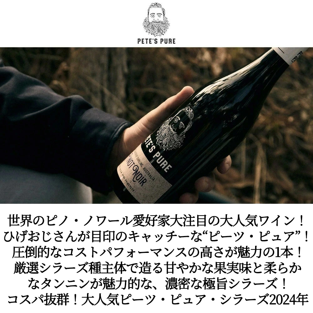 【商品説明】シラーズ愛好家大注目!オーストラリアワイン愛好家大注目!ひげおじさんが目印のキャッチーな大人気ワイン“ピーツ・ピュア”!圧倒的なコストパフォーマンスの高さが魅力!土地と品種の特徴を反映した分かりやすく、ピュアな味わいが人気の秘密! インポーターさんの生産者のコメントは「ピーツ・ピュアは、分かりやすい美味しさと、圧倒的なコストパフォーマンスの高さが魅力のワインを生み出す、ニュー・サウス・ウェールズ州のワイナリー。友人であり、ワインへの志を共にするエド・ピーター氏とピーター・カイト氏によって2015年に創業され、2人の名前に共通する「ピーター」から名付けられました。かつてヴィンヤード・マネージャーを務めた人物ピート氏をモチーフに、「大地を愛し、畑仕事には手を抜かない」という姿勢をシンプルに貫き通したピュアな信念のもと、自然環境・人・次世代に配慮したサステナブルなワイン造りを行っています。 造られるワインは、オーストラリア国内のワインコンクール、リバーランド・ワイン・ショー2021にて、ピノ・グリージョとシラーズがゴールドメダル、シャルドネとソーヴィニヨン・ブランを含む4銘柄がブロンズメダルを獲得するなど、高い評価を得ています。生産者曰く、「平日のディナーやビーチでのピクニック、あるいは自宅でのリラックスタイムなどに、友人や家族と共有するためデザインされたワイン」。料理と合わせるなら、魚介からお肉料理、ブルスケッタやフライドポテトそしてタコスまで、非常に幅広く寄り添う味わいです。是非日々のリラックスタイムや休日にお愉しみください。」とコメント! このピーツ・ピュア・シラーズ[2024]年は、夏季の温暖で豊富な日照により、果実の味わいを豊かにするテロワールからの樹齢15年-20年の厳選シラーズ主体に複数の黒ブドウをブレンド!収穫されたブドウは温度管理されたステンレスタンクにて発酵され、発酵中にオークチップを添加!清澄には植物由来の成分を使用! 外観は深い紫色の色調!熟したブルーベリーやブラックチェリーなどのアロマにチョコレートや程よい樽由来のバニラやトーストのニュアンスが香り立ちます!口に含むと甘やかな果実味に、しっかりとした酸味と柔らかなタンニンが重なる味わい!ブラックペッパーやシナモンなどスパイスの風味を纏った余韻が続く、凝縮感のある1本!甘やかな果実味と柔らかなタンニンが魅力的な、濃密な極旨シラーズ!ひげおじさんが目印のキャッチーなピーツ・ピュアが遂に待望入荷!
