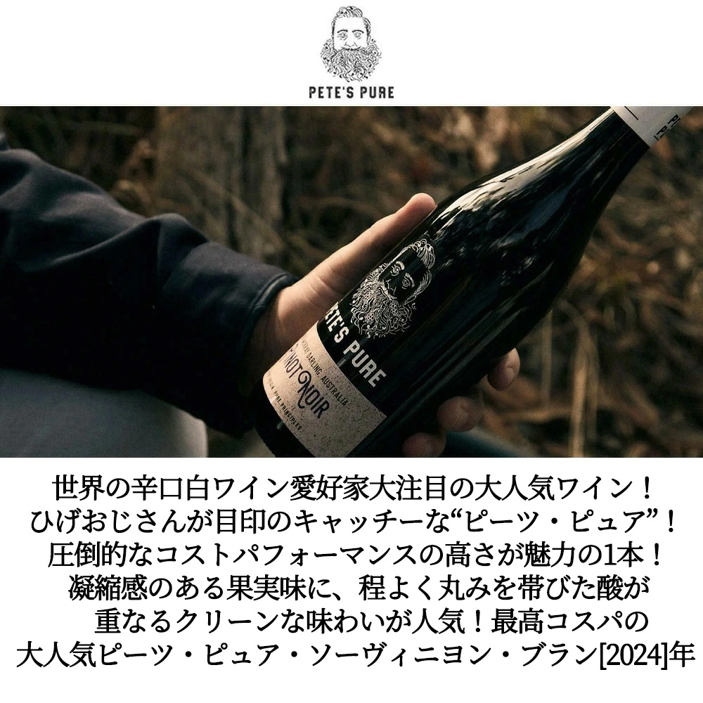 【商品説明】世界の辛口白ワイン愛好家大注目!オーストラリア・ソーヴィニヨン・ブラン愛好家大注目! ひげおじさんが目印のキャッチーな大人気ワイン“ピーツ・ピュア”!圧倒的なコストパフォーマンスの高さが魅力!土地と品種の特徴を反映した分かりやすく、ピュアな味わいが人気の秘密! インポーターさんの生産者のコメントは「ピーツ・ピュアは、分かりやすい美味しさと、圧倒的なコストパフォーマンスの高さが魅力のワインを生み出す、ニュー・サウス・ウェールズ州のワイナリー。友人であり、ワインへの志を共にするエド・ピーター氏とピーター・カイト氏によって2015年に創業され、2人の名前に共通する「ピーター」から名付けられました。かつてヴィンヤード・マネージャーを務めた人物ピート氏をモチーフに、「大地を愛し、畑仕事には手を抜かない」という姿勢をシンプルに貫き通したピュアな信念のもと、自然環境・人・次世代に配慮したサステナブルなワイン造りを行っています。造られるワインは、オーストラリア国内のワインコンクール、リバーランド・ワイン・ショー2021にて、ピノ・グリージョとシラーズがゴールドメダル、シャルドネとソーヴィニヨン・ブランを含む4銘柄がブロンズメダルを獲得するなど、高い評価を得ています。生産者曰く、「平日のディナーやビーチでのピクニック、あるいは自宅でのリラックスタイムなどに、友人や家族と共有するためデザインされたワイン」。料理と合わせるなら、魚介からお肉料理、ブルスケッタやフライドポテトそしてタコスまで、非常に幅広く寄り添う味わいです。是非日々のリラックスタイムや休日にお愉しみください。」とコメント! ピーツ・ピュア・ソーヴィニヨン・ブラン[2024]年で見事、サクラワインアワード2026にてシルバー受賞!夏季の温暖で豊富な日照により、果実の味わいを豊かにするテロワールからの樹齢15年~20年の厳選ソーヴィニヨン・ブラン主体にシャルドネ、セミヨン使用!温度管理されたステンレスタンクにて発酵され、清澄には動物由来の成分を不使用で造られる辛口白ワイン!外観は淡いレモンイエローの色調!レモンや熟したトロピカルフルーツのアロマに、若草やハーブを思わせるニュアンスが香り立ちます!口に含むと凝縮感のある果実味に、程よく丸みを帯びた酸が重なるクリーンな味わい!ピュアで親しみやすい、爽やかな1本!ひげおじさんが目印のキャッチーなピーツ・ピュアが遂に待望入荷!
