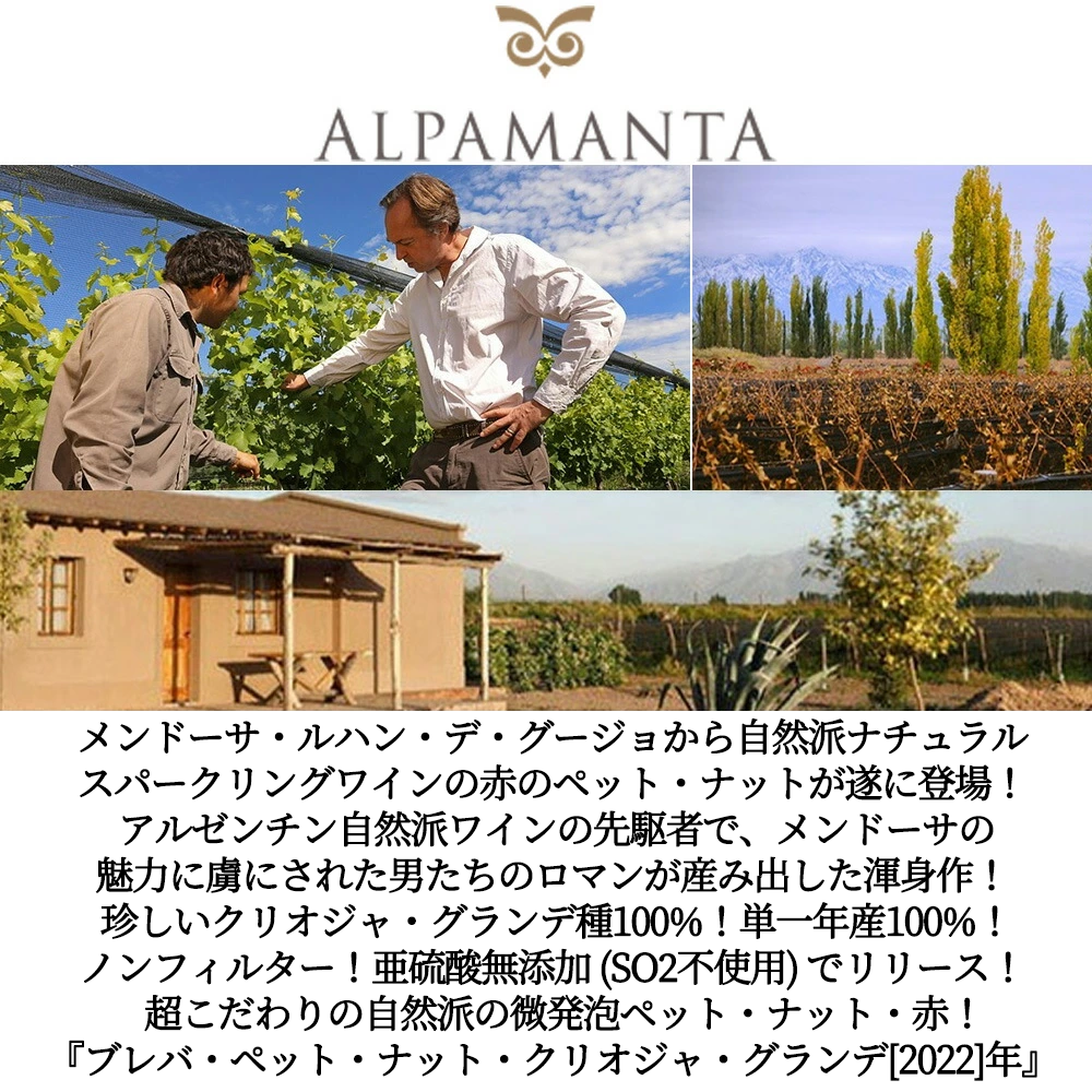【商品説明】今、話題の人気急上昇中のナチュラルワインのジャンル「ペット・ナット」! アルゼンチン・メンドーサ・ルハン・デ・グージョから自然派ナチュラルスパークリングワインの赤のペット・ナットがついに登場! ペットナット (「ペットナット」というちょっとユニークな呼び名のフルネームは「ペティヤン・ナチュレル (Petillant Naturel) 」といい、「ペットナット(Pet-Nat)」は略称というわけです。) メンドーサの魅力に虜にされた男たちのロマンが産み出したビオディナミ・プレミアム・アルゼンチンワイン! アルゼンチンの自然派ワインの先駆者「アルパマンタ」が亜硫酸無添加・ノンフィルターで仕上げるこだわり赤のペット・ナット!造り手のアルパマンタ・エステイト・ワインズは、2005年、伝統的なワイン産地ヨーロッパで代々ワイン産業に携わってきた家系出身の3人の友人、オーストリアのアンドレイ・ラストモスキィ、同氏の従兄弟であるアンドレ・ホフマン氏がスイスから、そしてフランスからはジェレミー・デレコート氏が、ニューワールドで最もブドウ栽培に適した地域であるアルゼンチンのメンドーサに集結し、ブティックワイナリーを創設!2005年にメンドーサから38km南方の銘醸地ルハン・デ・クージョ南部、手付かずの自然が残るウガルテチの地に35haの土地を購入!生態系との調和の中でワインを産み出すことをモットーにブドウを栽培、ビオディナミの認定機関デメテール認定をアルゼンチンで最初に取得 (2010年) !畑では一切殺虫剤、除草剤を使用せず、自家製のビオディナミ調合剤を使用!動物を飼育し、雑草を食べさせたり自家製の堆肥を造り使用!醸造面においても天然酵母を使用しSO2も最小限に抑え、メンドーサのテロワール、太陽の恵みを表現した極上のワインをコンセプトにワイン造りを行っています!現地の言葉で“大地を愛す”を意味するブランド名「アルパマンタ」!代々インディアンの文化の軸となってきたのは、自然・環境とのハーモニーの中で働き、共存することでした!アルパマンタではこの考えを守り大地を耕し、環境に優しい畑がアルパマンタのテロワールであるというメッセージを込めワイン造りを行っています!現在ではヨーロッパをはじめ世界の星付きレストランでもオンリストされる実力派ワイナリー! この「ブレバ・ペット・ナット・クリオジャ・グランデ2022年」は、木苺のような甘酸っぱい果実が特徴的なペット・ナット!粘土と砂質の入り混じった表土に石灰岩が深層にある土壌からの珍しい自然派・ビオディナミ (デメテール認証) のクリオジャ・グランデ種100%使用!メトド・アンセストラル方式/MLFあり!天然酵母!残糖度1.27g/Lの辛口!ガス圧3.22バール!ノンフィルター!亜硫酸無添加 (SO2不使用) !で瓶詰された、有機栽培に拘るアルゼンチンの銘醸が造る赤のペットナット!フレッシュさの中に澱由来のチェリーのようなコクのある果実味が特徴!珍しいアルゼンチン産クリオジャ・グランデ種100%!しかも単一年産100%のミレジメ・スパークリングワインが正規品で限定少量入荷!吹きこぼれる可能性の高いワインです。開栓の際はよく冷やして注意を払い、慎重に開けてください。