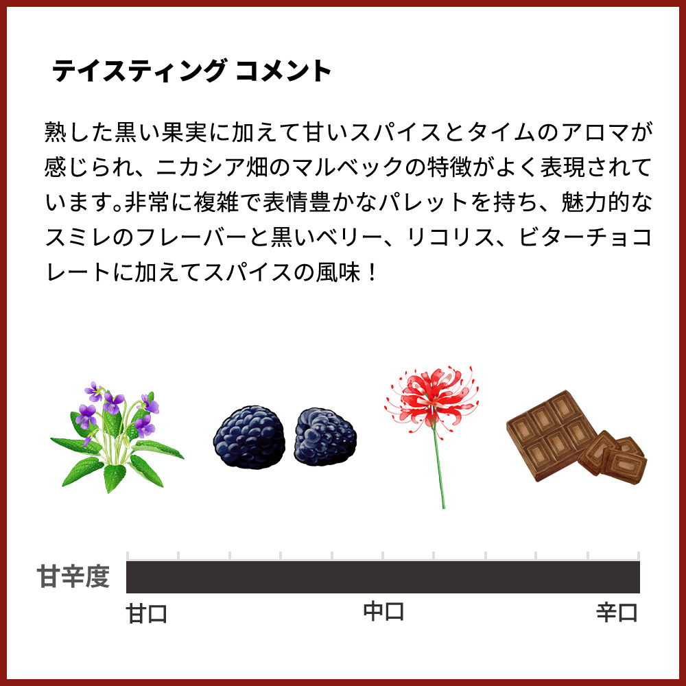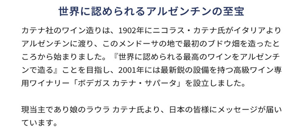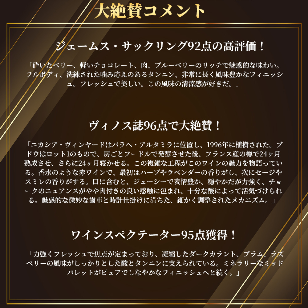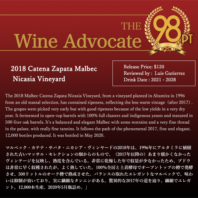 【商品説明】ついに入手に成功!入手困難!世界のフルボディ辛口赤ワイン愛好家垂涎の超レアワイン!「最高峰のアルゼンチンワインを追求」する、超高級ワイン!ボデガス・カテナ・サパータの少量生産シングルヴィンヤーズもの!渾身の単一畑産マルベック! 造り手カテナについて「カテナの歴史は1902年にニコラ カテナ氏がイタリアよりアルゼンチンに渡り、メンドーサでブドウ畑を開墾したことから始まります。当初は国内消費者向けにワインを造り、アルゼンチン最大級のワイナリーまで成長しましたが、三代目にあたる現当主ニコラス カテナ氏が1980年代に高級カリフォルニアワインの世界での成功・発展に刺激を受け、当時の醸造責任者ホセ ガランテ氏と共に「世界に認められる最高のワインをアルゼンチンで造る」ことを目指し、高級ワイン造りに取り掛かりました。2001年にフラッグシップである「ニコラス カテナ サパータ」を発売。世界各地で行われたブラインドテイスティングで1位、2位に入る快挙を果たし、世界にカテナのワインが知られるようになりました。また、その功績が讃えられ、ニコラス カテナ氏は2009年に英Decanter誌の「マン オブ ザ イヤー」に南米の造り手としては初めて選ばれました。 現在は、娘のラウラ カテナ氏が中心となり、テロワールやマルベックの研究を行い、ブドウ栽培の品質向上に努めています。アンデス山脈の麓、標高850~1,500mに6つの自社畑を所有しています。同一品種を標高の異なる畑で栽培し、様々なタイプのブドウを生産しています。山岳地帯の高地にある痩せた沖積土で、冷涼な気候です。そのため、自然と収量は減り、ブドウはゆっくりと徐々に成熟するため、凝縮感の高いブドウが収穫できます。また、冷涼な気候下では光合成が途切れることなく進行するため、ポリフェノールがより多く蓄積されます。2001年に、ラ ピラミデ畑の中に、最新の設備を備えたワイナリーを建設。カテナ氏は”革新性””先進性”の象徴として、アメリカ大陸の文明の中で最も優れた文明を持っていたとされるマヤのピラミッドを模したデザインを取り入れました。手摘み収穫されたブドウはこの中の選果台にて選り分けられ、グラヴィティシステムを採用した設備にて醸造が行われます。カテナでは同じ品種を異なる畑に植え、それぞれ別々に醸造し、アッサンブラージュしてワインを造り上げます。」! ワイン愛好家の皆様から多数のお問い合わせを頂いていた、幻のマルベック100%!スペシャル・キュヴェ!しかも超希少!ニコラス・カテナのおじいちゃんの名に由来する特別に選別された挿し木から造られるこの高級ニカシア・ヴィンヤードで、もちろんロバート・パーカー満点★★★★★5つ星で、この[2018]年でなんと驚異の98点高評価でコメントは「マルベック・カテナ・サパタ・ニカシア・ヴィンヤードの2018年は、1996年にアルタミラに植樹された古いマッサル・セレクションの畑からのもので、(2017年以降の)あまり暖かくなかったヴィンテージを反映し、熟度を含んでいる。非常に乾燥した年で収量が少なかったため、ブドウは非常に早く収穫されたが、よく熟していた。100%全房と土着酵母でオープントップの樽で発酵させ、500リットルのオーク樽で熟成させた。バランスの取れたエレガントなマルベックで、味わいは抑制が効いており、実に繊細なタンニンがある。驚異的な2017年の道を辿り、繊細でエレガント。12,000本生産。2020年5月瓶詰め。」と大注目! ジェイムス・サックリング96点でコメントは「砕いたベリー、軽いチョコレート、肉、ブルーベリーのリッチで魅惑的な味わい。フルボディ、洗練された噛み応えのあるタンニン、非常に長く風味豊かなフィニッシュ。フレッシュで美しい。この風味の清涼感が好きだ。」! ヴィノス誌96点でコメントは「ニカシア・ヴィンヤードはパラヘ・アルタミラに位置し、1996年に植樹された。ブドウはロット1のもので、房ごとフードルで発酵させた後、フランス産の樽で24ヶ月熟成させ、さらに24ヶ月寝かせる。この複雑な工程がこのワインの魅力を物語っている。香水のような赤ワインで、最初はハーブやラベンダーの香りがし、次にセージやスミレの香りがする。口に含むと、ジューシーで表情豊か、穏やかだが力強く、チョークのニュアンスがやや肉付きの良い感触に包まれ、十分な酸によって活気づけられる。魅惑的な微妙な歯車と時計仕掛けに満ちた、細かく調整されたメカニズム。」! ワインスペクテーター95点でコメントは「力強くフレッシュで焦点が定まっており、凝縮したダークカラント、プラム、ラズベリーの風味がしっかりとした酸とタンニンに支えられている。ミネラリーなミッドパレットがピュアでしなやかなフィニッシュへと続く。」と大注目! 究極シングル・ヴィンヤーズもの!もう一つのシングル・ヴィンヤード“アドリアンナ”より石灰質の含有の多い畑“ニカシア・ヴィンヤーズ” (標高1,180mに位置する畑) 