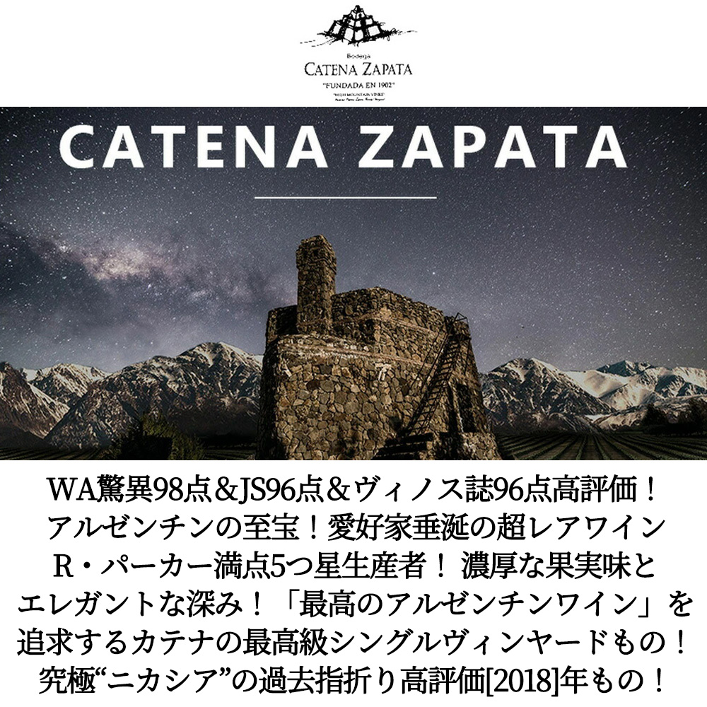 【商品名】カテナ・サパータ・“ニカシア・ヴィンヤード”(シングル・ヴィンヤード)・マルベック[2018]年・蔵出し品・手摘み100%・フレンチオーク樽100%発酵&熟成&フレンチオーク樽100%で24ヶ月熟成・ボデガス・カテナ・サパータ元詰・重厚ボトル・正規品・ワインアドヴォケイト驚異の98点&ジェイムス・サックリング96点&ヴィノス誌96点&ワインスペクテーター95点・正規品・赤・辛口・フルボディ【英名】CATENA ZAPATA Nicasia Vineyard (Single Vineyard) Malbec 2018 Mendoza