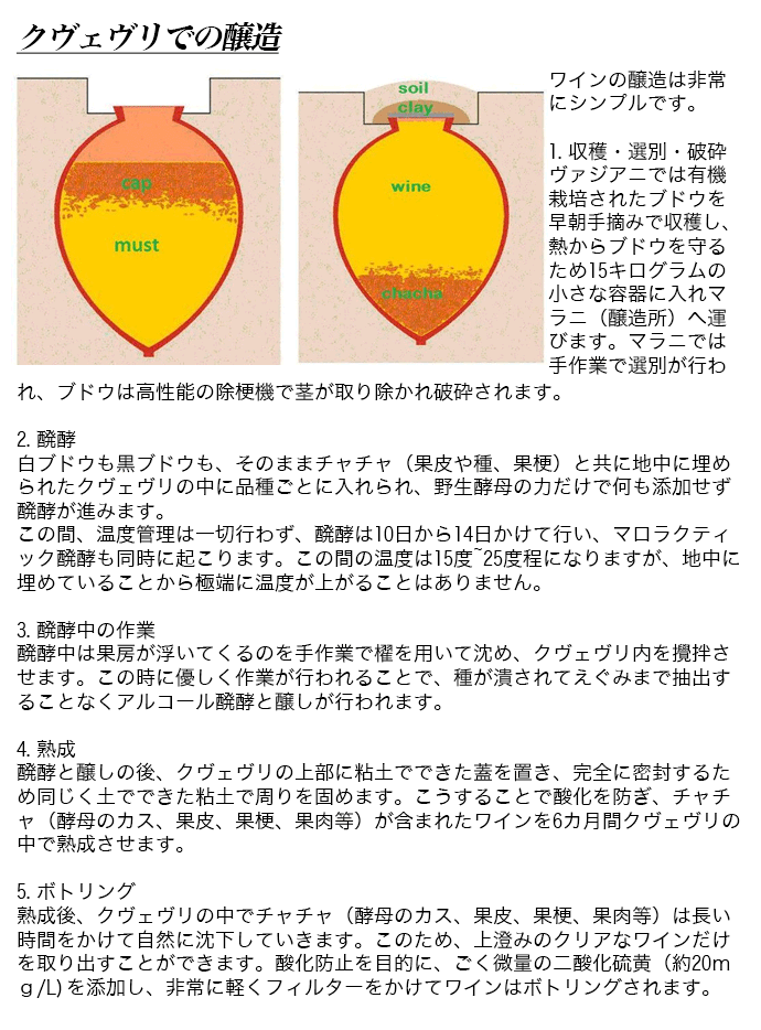 ![]() マカシヴィリ・ワインセラー ルカツィテリ 2021年 ヴァジアニ・カンパニー ■ 品種:ルカツィテリ種100% ■ 樹齢:25年 ■ 土壌:腐植質炭酸塩土を含む沖積土壌 ■ 年間生産量:10000本 ■ 発酵:天然酵母で果皮ごとクヴェヴリ醗酵(マロラクティック醗酵) ■ 熟成:果皮と共にクヴェヴリで6カ月 アプリコットや黄桃の風味を持ち、果実の蜜や甘やかさも特徴)を天然酵母で果皮ごとグヴェヴリ醗酵!果皮と共にグヴェヴリで6ヶ月熟成で造られるこのアンバーワインは、桃やマルメロの豊潤な果実味と複雑味!バランスがよく、フェノリックな要素と長い余韻が魅力の逸品!クリーン系ジョージアの入門編!ゆったりと優しく、ふくよかでそれであって優れたバランスを持つヴァジアニのアンバー(オレンジ)ワイン。 オレンジ・ワイン 白ブドウを赤ワインの醸造法(果皮や種を一緒に漬け込み醗酵し醸す方法)を用いて醸造することで、白ワインでもロゼワインでもない、濃い色調やタンニン成分(渋みや強い口当たり)、独特の風味を持つワインスタイルです。 ジョージアではクヴェヴリ仕込みのオレンジ・ワインをアンバー・ワイン(琥珀色のワイン)と呼んでいます。 |