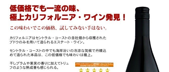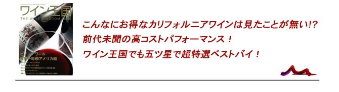 | ■ワインについて | カリフォルニア ジンファンデルファン大注目!前代未聞の高コストパフォーマンス辛口フルボディ赤ワイン!ワイン王国30号で最高の★★★★★5つ星超特選ベストバイワイン獲得!「TASTER'S Guild International金星受賞」&Pacific Rim Int'lで“Best of Class"受賞!(2006)年 パソ・ロブルスと、ロダイにある7つの異なるヴィンヤードから収穫されたジンファンジル100%で造られるエレガントで濃厚でスパイシーな!余韻に微かに甘さすら感じさせる究極フルボディ辛口赤ワインが少量入荷! |