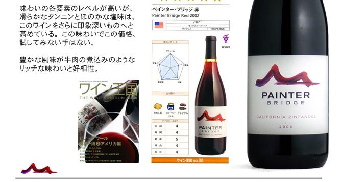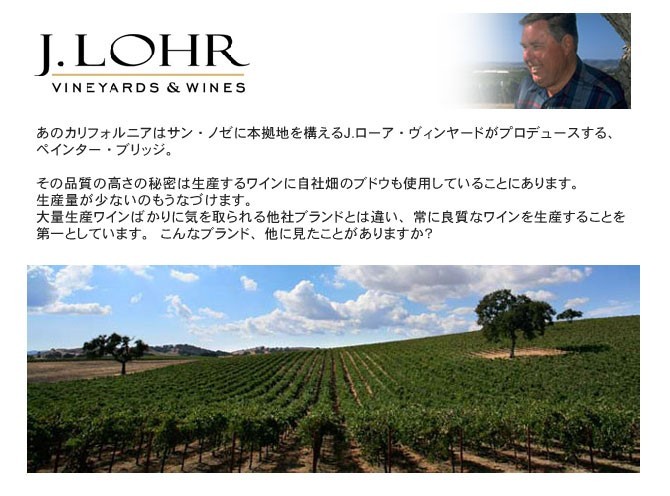 | ■生産者について | あのカリフォルニアはサン・ノゼに本拠地を構えるJ.ローア・ヴィンヤードがプロデュースする、ペインター・ブリッジ。その品質の高さの秘密は生産するワインに自社畑のブドウも使用していることにあります。生産量が少ないのもうなづけます。 大量生産ワインばかりに気を取られる他社ブランドとは違い、常に良質なワインを生産することを第一としています。 こんなブランド、他に見たことがありますか? |