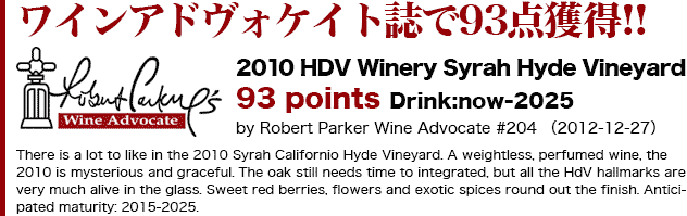 希少!カリフォルニア・ナパ産シラー種100%辛口赤ワイン愛好家大注目!年産わずか200ケースあまり!造り手は、ブルゴーニュのトップ生産者であり、世界のワインの最高峰!世界のワイン愛好家垂涎!のDRC(ドメーヌ・ド・ラ・ロマネ・コンティ)のヴィレーヌ家とカリフォルニア・ナパの銘醸「キスラー」や「パッツ&ホール」などの名だたる生産者へのブドウの供給家でもあるハイド家によるプライヴェート・プロジェクト!!2010年のシラーでワインアドヴォケイト誌驚異の93点獲得!ヴィノス誌でもアントニオ・ガッローニから驚異の高得点獲得!約1.2haの畑のシラー種(4種のクローン)をなんと一本の枝に一房のみ残すという、徹底した収量制限によりワインに凝縮感を持たせ、さらにフレンチオーク樽で11~14ヶ月熟成!しかもノンフィルター、ノンコラージュでボトル詰め!ブラックベリーやブラックチェリーなどのベリー系果実や、コショウやシナモンなどのスパイス、チョコレートなどの様々な香りに溢れています。しかも溶け込んだタンニンの口当たりが滑らかで、ボリューム感のある究極フルボディ辛口赤ワインが飲み頃5年熟成で限定で極少量入荷!