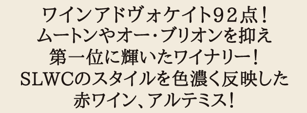 ナパ・ヴァレーの歴史を先導してきたSLWCによる、同地域のテロワールを表現したワイン。複雑なミクロクリマ、土壌構成を持つ同地域において、ワイナリーのスタイルを色濃く反映したワインシリーズ。良いワインづくりのためにナパヴァレー各地から良質のぶどうを得てブレンドすることから、ギリシャ神話の狩猟の女神に因む。自社畑(フェイ・S.L.V)を中心に、ナパ南端のカーネロスから北部のカリストーガまで、各サブリージョンからカベルネ・ソーヴィニヨンを収穫。それぞれの畑がワインの個性となって、見事なハーモニーをもたらす。