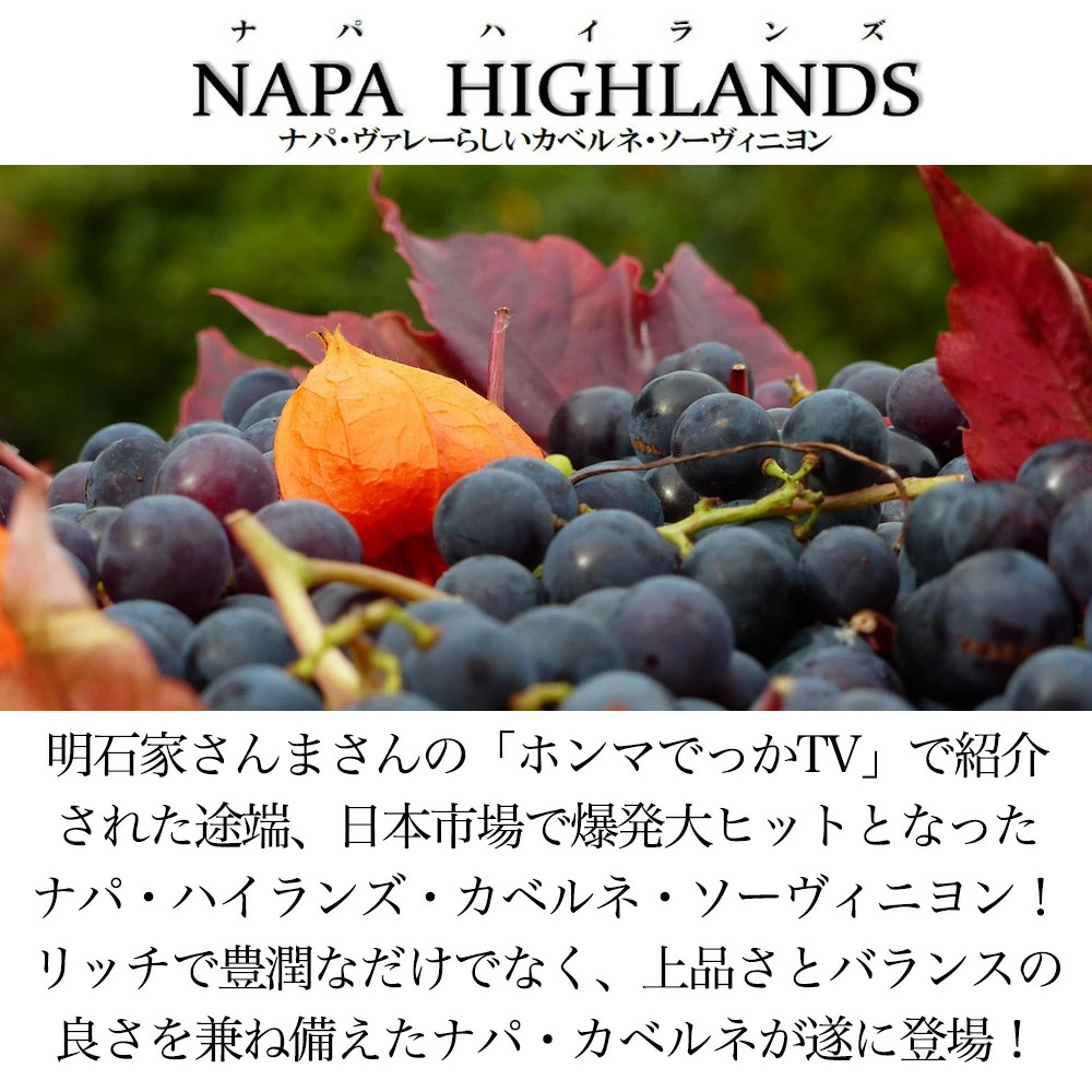 【商品説明】カリフォルニア辛口フルボディ赤ワイン愛好家大注目!あの2017年末、明石家さんまさんの「ホンマでっかTV」で紹介された途端、日本市場で爆発大ヒットとなったナパ・カベルネ!今もなお非常に人気のあるナパ・ハイランズ・カベルネ・ソーヴィニヨン!「ナパ・ハイランズ」はナパ・ヴァレーの葡萄栽培農家と密接な関係を築き、ナパ・ヴァレーのカベルネ・ソーヴィニヨンらしさを生み出すべく、非常に評価の高い中心的な二つのAVAであるオークヴィルとヨントヴィルの葡萄をブレンド!ラベルにはナパ・ヴァレーの古き良き田舎の風景が描かれ、自然の恩恵により育まれた良質なナパ・ヴァレーのワインを生み出しております!この「ナパ・ハイランズ・カベルネ・ソーヴィニヨン」は、オークヴィル地区とヨントヴィル地区の数か所の畑のカベルネ・ソーヴィニヨン90%とプティ・ヴェルド10%を優しく破砕後、48時間の低温浸潤でアロマと色合いをゆっくり引き出した後、主発酵に入る。主発酵終了後、更に2週間皮や果梗と共にマセラシオンを行いまろやかな果実味を加味する。優しく圧搾後、フレンチオーク樽&アメリカンオーク樽で驚異の20ヶ月熟成で造られる究極フルボディ辛口赤ワイン!味わいについても「典型的なクラシックなナパ・ヴァレーの特徴を良く表しており、カベルネ・ソーヴィニヨンの特徴であるリッチでフレッシュなベリー系の果実味、力強いタンニン、ブラック・チェリー、ココアの要素が詰まり、樽から来るヴァニラ香り、グローヴなどのス敗ス、森林のニュアンスが心地よい。食事と共に杯が進むワインとなっており、リブアイ・ステーキ、牛のバラ肉の煮込み、炭火焼の肉料理全般、甘いソースの鴨のローストなどとよく合う。」!リッチで豊潤なだけでなく、上品さとバランスの良さを導き食事との楽しみが広がるナパ・ハイランズ・カベルネ・ソーヴィニヨン・ナパ・ヴァレーが素晴らしい出来栄え[2023]年で遂に登場!