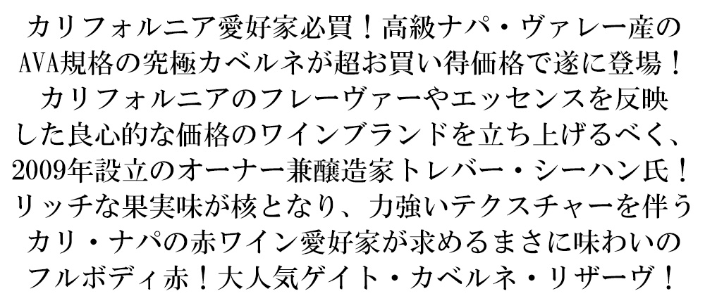 ゲイト カベルネ ソーヴィニヨン リザーヴ 2020 プレシジョン ワイン カンパニー社 ナパ ヴァレーAVA 醸造家トレバー シーハン氏 赤ワイン