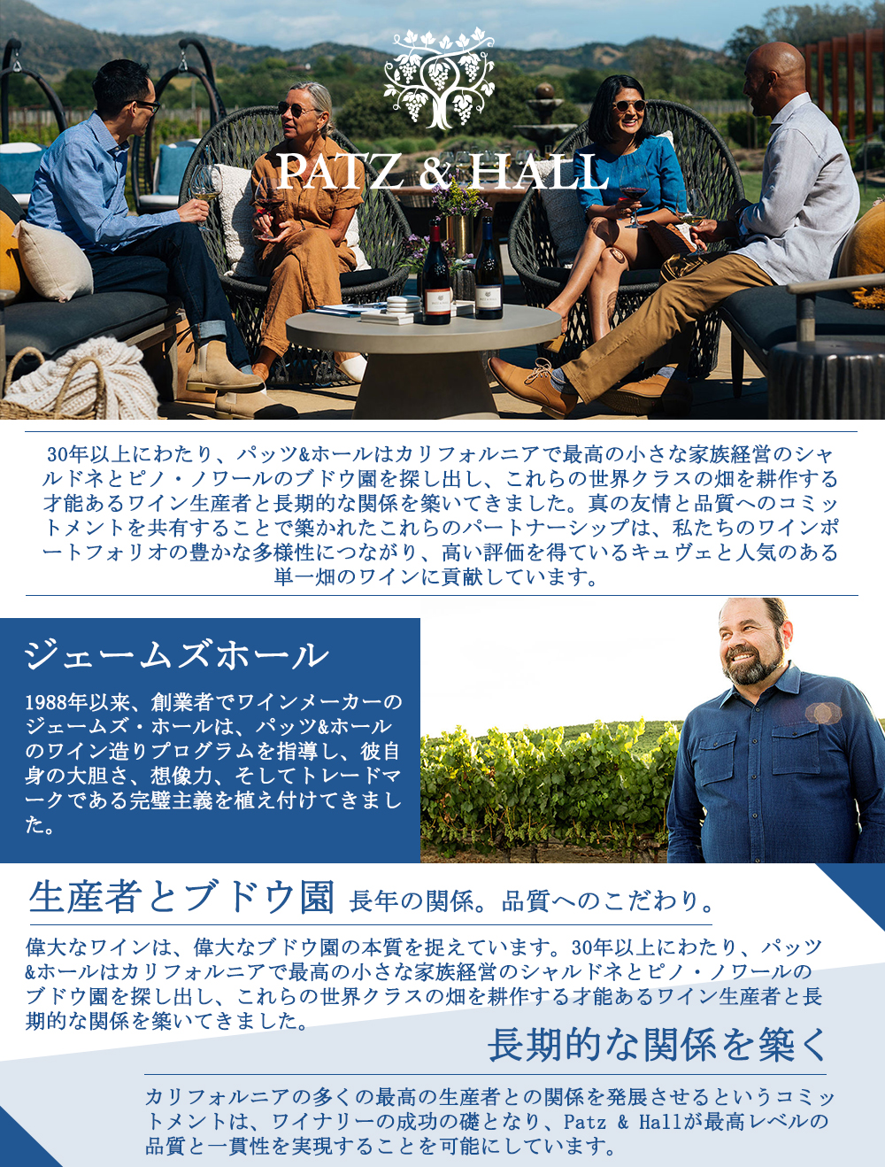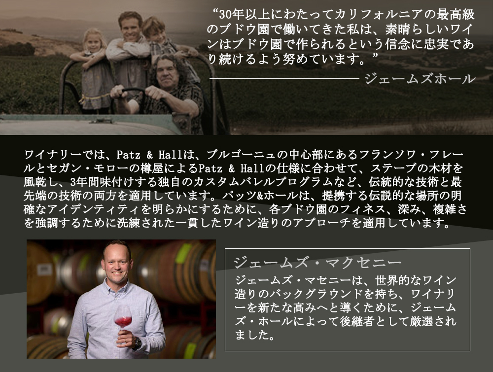 【パッツ&ホールでは、自社畑は持たず、設立当初から最高の畑を探し求め、ソノマ、ナパで有能なブドウ栽培者たちと長期的な関係を築いてきました。ロシアン リバー ヴァレー、カーネロス、メンドシーノ カウンティ、ソノマ コースト、サンタ ルチア ハイランズ各地区を代表するオーナーと契約して一緒にワインを造っています。それぞれの畑のポテンシャルを最大限に引き出すため、キュヴェごとに樽や酵母、クローンの選定にこだわって醸造を行っています。