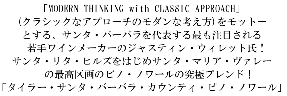 【オーナーでワインメーカーのジャスティン・ウィレットは自身の「タイラー」だけでなくコンサルタントとしても高く評価されています。著名なソムリエとの交友も深く、Erick Railsback(以前RN74、現在はサンタバーバラのCaveau)とはロワール品種に限定したワイナリー「Lieu Dit」を運営、ニューヨークのDustin Wilson(Eleven Madison Parkのワインディレクター)とは北ローヌ品種に的を絞ったワイナリー「Vallin」を運営するなどその活躍は新たな才能の誕生を十分に感じさせるものです。エレガントな素直でそしてピュアなアロマを持ったワインを生産するために、秀逸な畑を選定することはもちろんですが、その中でも古樹のある畑を重視しています。