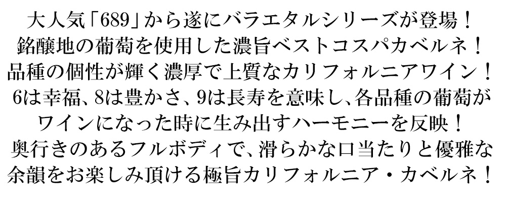 689という数字は、バラバラのものが一つに調和、融合する、という意味を持ちます。表ラベルのデザインが表すように 「6-幸福」 「8-豊かさ」 「9-長寿」 の意味をもった各数字が一つのデザインとして合体しています。この689ワインは、各品種のブドウが、ワインになった時に生み出すハーモニーを反映しています。この689を飲んで、幸福、富、長寿を経験してください!