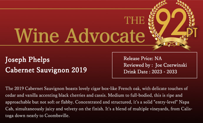 【商品名】ジョセフ・フェルプス・カベルネ・ソーヴィニヨン[2019]年・自社畑100%・オーク樽18ヶ月熟成(フレンチオーク&アメリカンオーク)・ジョセフ・フェルプス・ヴィンヤーズ社元詰・ナパ・ヴァレー(セント・ヘレナ)・ワインアドヴォケイト誌驚異の92点(今-2033年)&ワインスペクテイター誌驚異の92点&ワインエンスージアスト誌驚異の94点&ラファエル・ヴェッキオーネ94点【英名】Joseph Phelps Cabernet Sauvignon 2019 Estate Grown Napa Valley Joseph Phelps Vineyards 14.5%