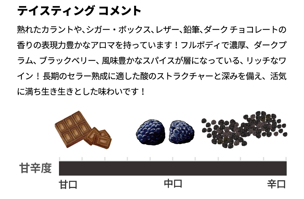 【ブドウの品種】カベルネ・ソーヴィニヨン93%、プティ・ヴェルド1%、マルベック1%、カベルネ・フラン3%、メルロー2%
