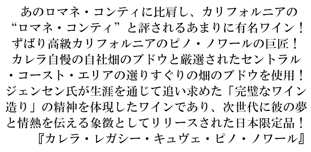 カレラ ジェンセン レガシー キュヴェ ピノ ノワール 2023 A.V.Aセントラルコースト 正規代理店輸入品<br>CALERA Jensen Legacy Cuvee Pinot Noir 2023 A.V.A Central Coast