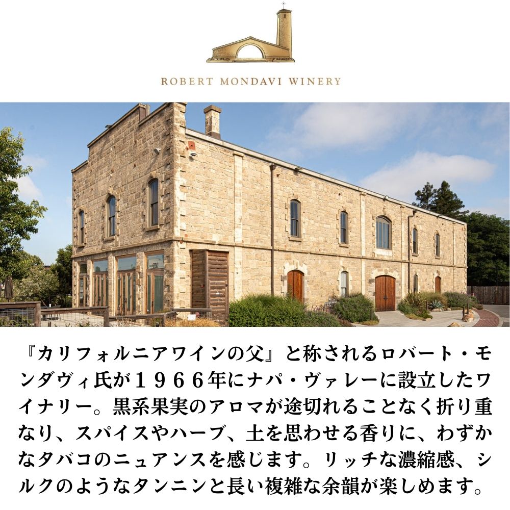 【商品説明】カリフォルニア フルボディ赤ワイン愛好家大注目!カリフォルニアワインの父と呼ばれる、ロバート・モンダヴィ。 世界中の偉大なワインと肩を並べるワインをカリフォルニアで造るという彼のヴィジョンは、その革命的精神と伝統を尊ぶ精神により見事に結実し、数々のプレミアムワインを世界中の食卓に届けています。 ロバート・モンダヴィ・ワイナリーは1966年、ナパ・ヴァレー、オークヴィルのト・カロンに創立されました。ト・カロンはギリシャ語で「最高の品質」「最高の美」という意味で、その名のとおり風光明媚な美しい情景と、最高品質のカベルネ・ソーヴィニヨンとソーヴィニヨン・ブランを生む場所として、ナパ・ヴァレーの理想郷といわれています。アーチと大きなタワーをシンボルとしたミッションスタイルのワイナリーは、あらゆる人々を温かく迎え入れ、かつ、最高のワインを生み出すナパの名所。ト・カロン・セラーと呼ばれるワイナリーでは、重力を使った優しい醸造工程と、フレンチオーク樽による丁寧な熟成過程を経て、ナパ・ヴァレーの魅力溢れるテロワールをワインに仕上げて、世界中の皆様にお届けしています。 この「カベルネ ソーヴィニヨン」はオークヴィルおよびスタッグス・リープ・ディストリクトといった、ナパヴァレーの恵まれた産地の特徴を融合したワイン。カベルネ・ソーヴィニヨンを主体にメルロー、カベルネ・フラン等をブレンドし、それぞれの個性が美しくバランスを保っています。完熟したブラックベリー、カシス、ミネラル、すみれ、ブラックリコリスのキャラクターに、ベルベットのようななめらかな口当たり、チョコレート、レバノン杉、スィートスパイスのノートが織り重なり、豊かな味わいを造り出しています。