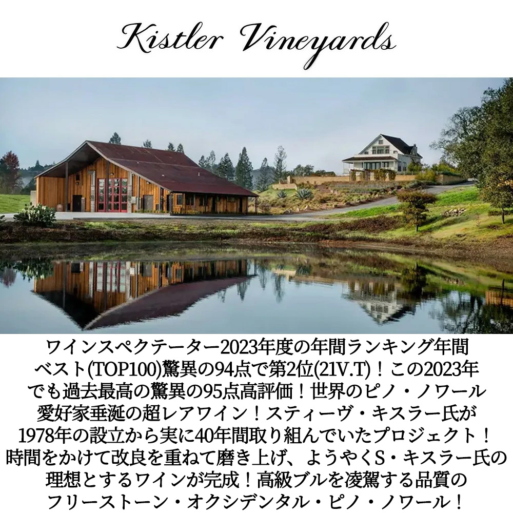 【商品説明】超入手困難!大人気!高級カリフォルニア産ピノ・ノワール100%辛口赤ワイン愛好家垂涎!ブルゴーニュ高級辛口赤ワイン愛好家大注目!前ヴィンテージ2021年のフリーストーン・オクシデンタル・ピノ・ノワールでワインスペクテーター誌94点獲得!しかも年間ベスト(TOP100)の第2位にランクイン(リリース1万5000作品の中、第5位の快挙)!世界中のワイン愛好家が絶賛するカリフォルニアソノマを代表する生産者!ロバートパーカー氏満点5つ星生産者! 1978年創設!スティーブ・キスラー氏を中心とするキスラーファミリーにより、ソノマ(ロシアン・ヴァレー)に創設!ブルゴーニュを主体にしたワイン造りで“カリフォルニアのシャルドネ王”と呼ばれ、ときに「ブルゴーニュのグラン・クリュも凌駕する」と言われ、世界最高峰!と言われるピノ・ノワールとシャルドネを生産!世界各国のワイン誌やワイン愛好家が大絶賛!まさに愛好家垂涎のレアワイン!事実!キスラーは今や名実ともに最も手に入れにくいカリフォルニアワインであり、世界最大のピノ・ノワールと言えます。 このフリーストーン・オクシデンタルは、スティーヴ・キスラー氏が1978年の設立から実に40年の時を経て、「ソノマ・コーストの地で、世界と肩を並べられるピノ・ノワールを造る!」という目的の元、娘であるキャサリン女史とエリザベス女史と共に取り組んでいる新しいプロジェクト(ソノマ・コーストの上級ピノ・ノワールの生産を目的としたワイナリーで、まさにキスラーの娘のようなブランド)!1980年代初頭にスティーヴ・キスラー氏がブルゴーニュのあるグラン・クリュから持ち帰ったという非常に貴重なピノ・ノワールを綿密なフィールド・セレクションにより植樹し、育てた希少ピノ・ノワール使用!実に20年以上の時間をかけて改良を重ねて磨き上げ、ようやくスティーブ・キスラー氏の理想とするワインが完成した「フリーストーン・オクシデンタル・ピノ・ノワール」! この2023年でワインスペクテーター驚異の95点でコメントは「ビター・チェリー、ダンソン・プラム、ラズベリーのクーリがきっちりと凝縮し、海風を思わせるミネラルが口いっぱいに広がり、最初から最後まで続く。アイリスとローズヒップのノートが背景を埋め、長く突き刺すようなフィニッシュは驚くほどピュアで飾り気のない感触を示す。完成度の高いピノ。2035年まで飲める。」と高評価! ボデガ・ヘッドランズ、オクシデンタル・ステーション、ボデガ・リッジの3つの畑のピノ・ノワールをブレンド!ボデガ・ヘッドランズの繊細さ、オクシデンタル・ステーションの芳醇なアロマ、ボデガ・リッジの凝縮感のあるリッチな果実味、とそれぞれのテロワールの個性を見事に引き出し、複雑で深みのある味わいを実現した1本!最高級カリフォルニア・ピノ・ノワール! ブルゴーニュのグラン・ヴァンファンも虜にする希少品が限定で待望の少量入荷!