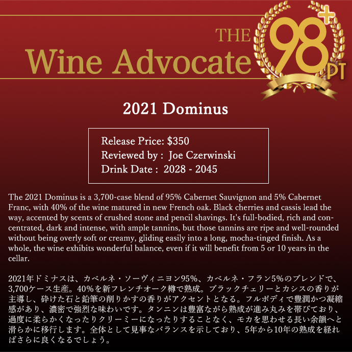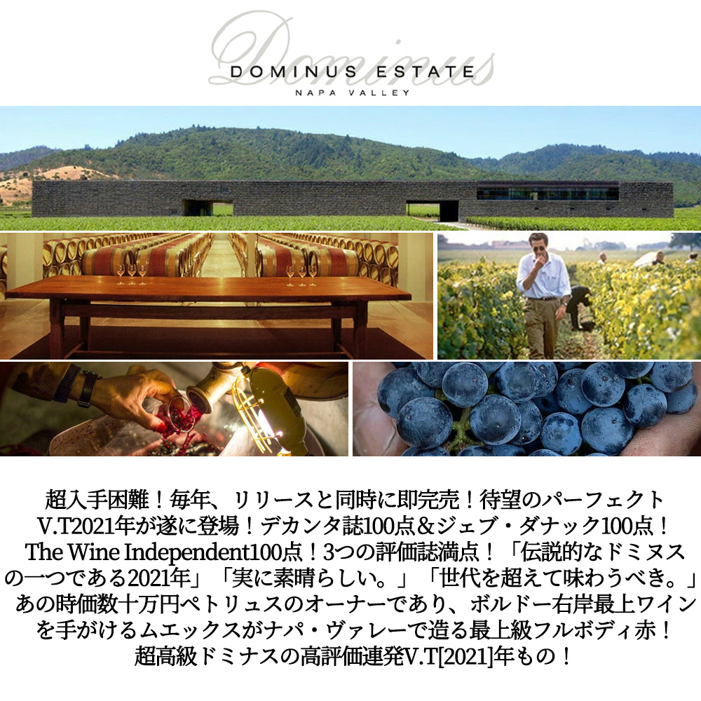 【商品名】ドミナス[2021]年・蔵出し品・ドミナス・エステート・ナパ・ヴァレー・クリスチャン・ムエックス・アルコール度数15%・正規代理店輸入品・デカンタ誌100点満点&ジェブ・ダナック100点満点&The Wine Independent100点満点&ジェームス・サックリング99点&ワインアドヴォケイト98+点&ヴィノス誌98点【英名】Dominus 2021 Napa Valley Dominus Estate Christian Moueix