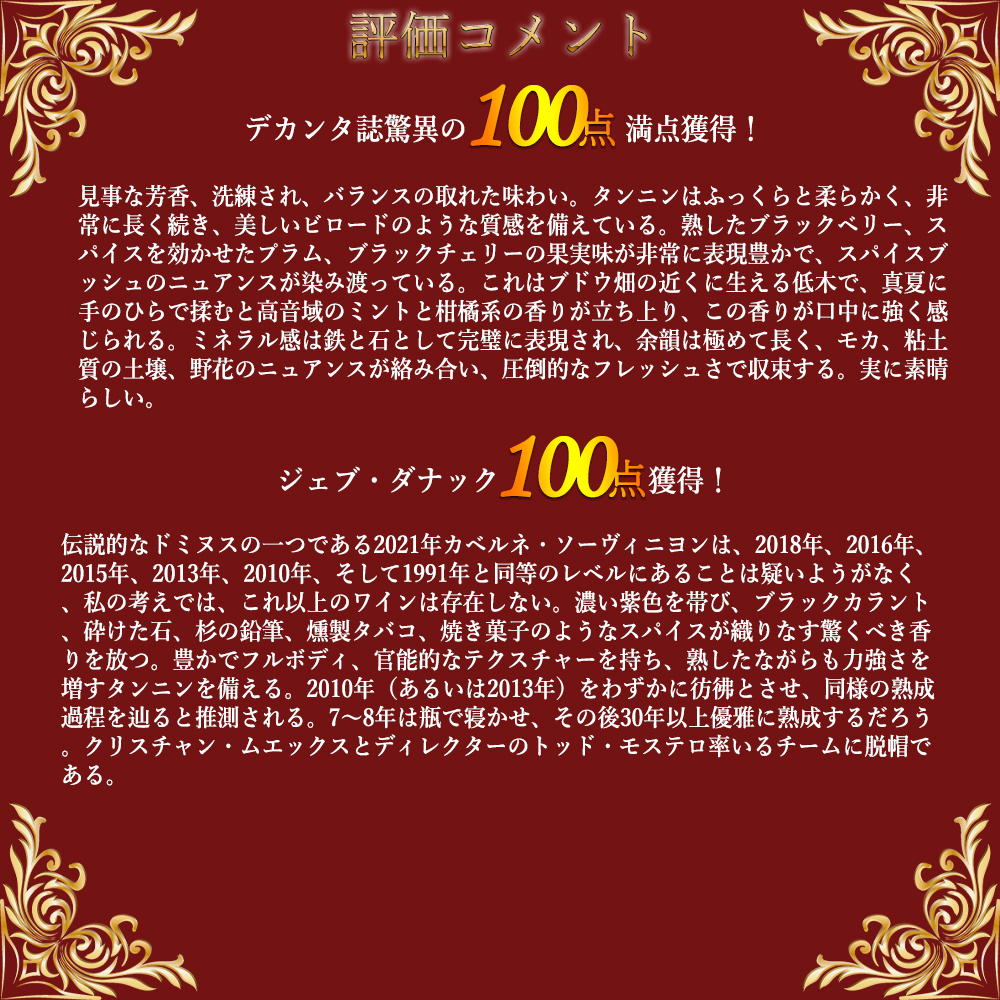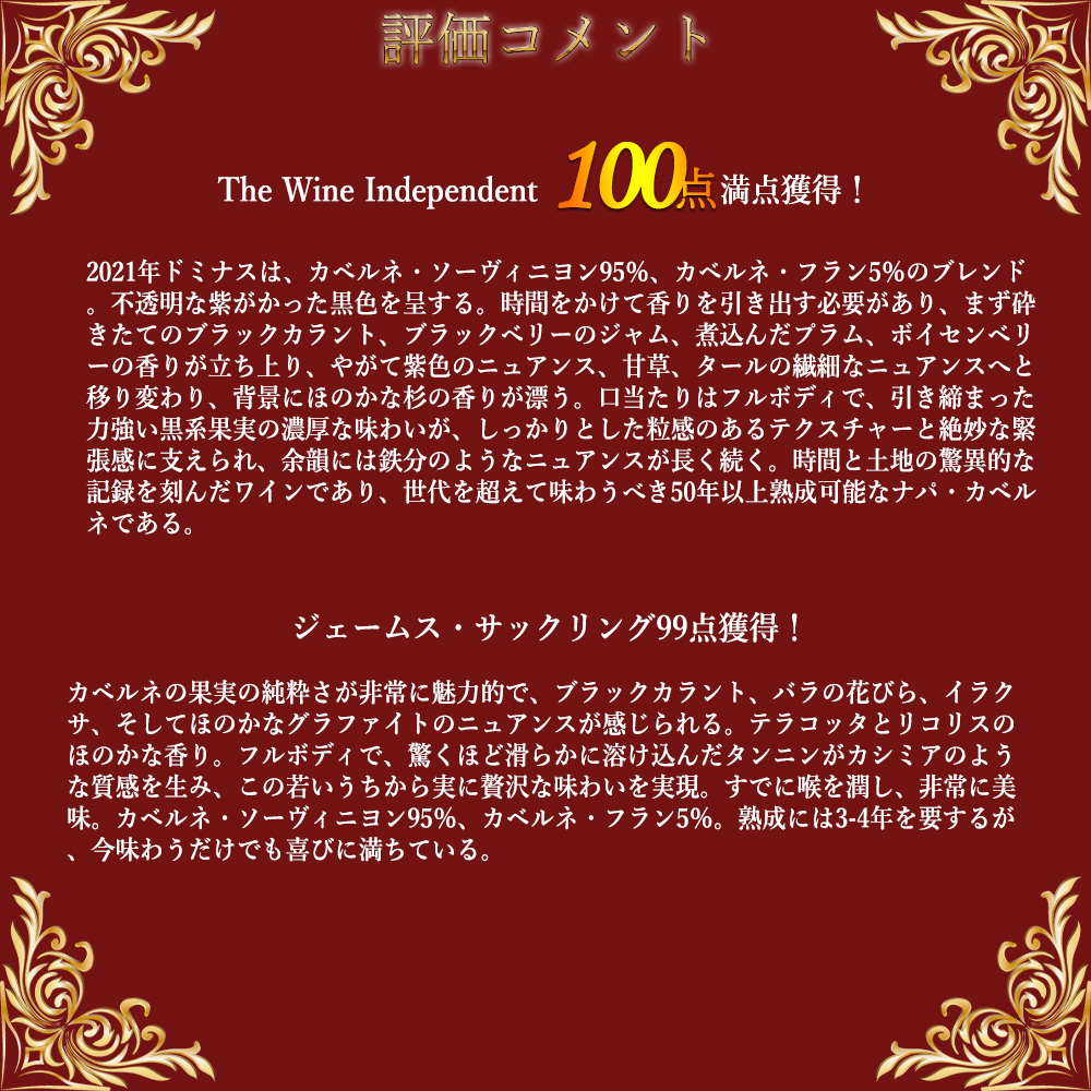 【商品説明】超入手困難!高級カリフォルニア ナパ フルボディ辛口赤ワイン愛好家大注目!カリフォルニア愛好家のみならずボルドー愛好家にもぜひ味わって頂きたい特別なワイン!あのボルドー最高峰最高級ワインのひとつ! シャトー・ペトリュスのオーナー一族でありトロタノワ他、ボルドー右岸最高級のワインを手がけるクリスチャン・ムエックスがナパ・ヴァレーで造る最上級フルボディ赤ワイン! この2021年でデカンタ誌100点満点&ジェブ・ダナック100点満点&The Wine Independent100点満点の快挙!クリスチャン・ムエックスの手による8回目のヴィンテージ(ドミナス自体の初ヴィンテージは1983年、ちなみにオーパス・ワンの4年後)! この2021年でデカンタ誌驚異の100点満点でコメントは「見事な芳香、洗練され、バランスの取れた味わい。タンニンはふっくらと柔らかく、非常に長く続き、美しいビロードのような質感を備えている。熟したブラックベリー、スパイスを効かせたプラム、ブラックチェリーの果実味が非常に表現豊かで、スパイスブッシュのニュアンスが染み渡っている。これはブドウ畑の近くに生える低木で、真夏に手のひらで揉むと高音域のミントと柑橘系の香りが立ち上り、この香りが口中に強く感じられる。ミネラル感は鉄と石として完璧に表現され、余韻は極めて長く、モカ、粘土質の土壌、野花のニュアンスが絡み合い、圧倒的なフレッシュさで収束する。実に素晴らしい。」! ジェブ・ダナック100点満点でコメントは「伝説的なドミヌスの一つである2021年カベルネ・ソーヴィニヨンは、2018年、2016年、2015年、2013年、2010年、そして1991年と同等のレベルにあることは疑いようがなく、私の考えでは、これ以上のワインは存在しない。濃い紫色を帯び、ブラックカラント、砕けた石、杉の鉛筆、燻製タバコ、焼き菓子のようなスパイスが織りなす驚くべき香りを放つ。豊かでフルボディ、官能的なテクスチャーを持ち、熟したながらも力強さを増すタンニンを備える。2010年(あるいは2013年)をわずかに彷彿とさせ、同様の熟成過程を辿ると推測される。7~8年は瓶で寝かせ、その後30年以上優雅に熟成するだろう。クリスチャン・ムエックスとディレクターのトッド・モステロ率いるチームに脱帽である。」と激賞! The Wine Independent100点満点でコメントは「2021年ドミナスは、カベルネ・ソーヴィニヨン95%、カベルネ・フラン5%のブレンド。不透明な紫がかった黒色を呈する。時間をかけて香りを引き出す必要があり、まず砕きたてのブラックカラント、ブラックベリーのジャム、煮込んだプラム、ボイセンベリーの香りが立ち上り、やがて紫色のニュアンス、甘草、タールの繊細なニュアンスへと移り変わり、背景にほのかな杉の香りが漂う。口当たりはフルボディで、引き締まった力強い黒系果実の濃厚な味わいが、しっかりとした粒感のあるテクスチャーと絶妙な緊張感に支えられ、余韻には鉄分のようなニュアンスが長く続く。時間と土地の驚異的な記録を刻んだワインであり、世代を超えて味わうべき50年以上熟成可能なナパ・カベルネである。」! さらにロバート・パーカー満点5つ星生産者で、この2021年で、ワインアドヴォケイト驚異の98+点でコメントは「2021年ドミナスは、カベルネ・ソーヴィニヨン95%、カベルネ・フラン5%のブレンドで、3,700ケース生産。40%を新フレンチオーク樽で熟成。ブラックチェリーとカシスの香りが主導し、砕けた石と鉛筆の削りかすの香りがアクセントとなる。フルボディで豊潤かつ凝縮感があり、濃密で強烈な味わいです。タンニンは豊富ながら熟成が進み丸みを帯びており、過度に柔らかくなったりクリーミーになったりすることなく、モカを思わせる長い余韻へと滑らかに移行します。全体として見事なバランスを示しており、5年から10年の熟成を経ればさらに良くなるでしょう。」と大注目! ジェームス・サックリング99点でコメントは「カベルネの果実の純粋さが非常に魅力的で、ブラックカラント、バラの花びら、イラクサ、そしてほのかなグラファイトのニュアンスが感じられる。テラコッタとリコリスのほのかな香り。フルボディで、驚くほど滑らかに溶け込んだタンニンがカシミアのような質感を生み、この若いうちから実に贅沢な味わいを実現。すでに喉を潤し、非常に美味。カベルネ・ソーヴィニヨン95%、カベルネ・フラン5%。熟成には3-4年を要するが、今味わうだけでも喜びに満ちている。」! ヒュージョンソン氏いわく「絹の手袋のようになめらかだが、中には力が詰まっている」!カベルネ・ソーヴィニヨン95%、カベルネ・フラン5%をフレンチオーク樽で16-8ヶ月熟成 (新樽率40%) で造られるこのワインは、凝縮した果実味に溶け込むシルキーなタンニンと柔らかな酸!溢れる果実のアロマに幾層にも重なるキャラクターが複雑さを演出し、より一層深みのある味わいに仕上げています!その後に訪れる長く甘美な余韻は飲み手を優しく魅了してくれます!ほとんどがカ