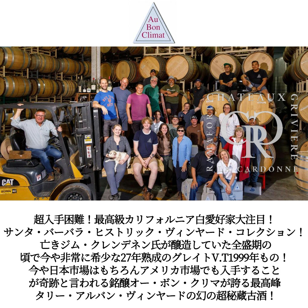 【商品説明】超入手困難!最高級カリフォルニア・シャルドネ愛好家大注目!高級ブルゴーニュ白愛好家大注目! サンタ・バーバラ・ヒストリック・ヴィンヤード・コレクション! しかも今や非常に希少な27年熟成のグレイトヴィンテージ[1999]年もの! しかも亡きジム・クレンデネン氏が醸造していた全盛期の頃の希少ヴィンテージ! あの「ブルゴーニュの神様」アンリ・ジャイエを師と仰ぎ、サンタ・バーバラを「カリフォルニアのコート・ドール」と言わしめ、“サンタ・バーバラの怪人”と異名をとる亡きジム・クレンデネン氏のワイナリー! ワインスペクテーター誌が選ぶ5つ星★★★★★ワイナリーで、2年連続ロバート・パーカー氏から「ベスト・ワイナリーオブ・ザ・ワールド」に選出された超実力派ワイナリー! この「オー・ボン・クリマ・シャルドネ・タリー・アルバン・ヴィンヤード」は、カリフォルニア州サン・ルイス・オビスポ郡のアロヨ・グランデ・ヴァレー(Arroyo Grande Valley AVA)に位置する著名なブドウ畑!太平洋から吹き込む冷涼な海風と朝霧の影響を強く受けるため、日中と夜間の寒暖差が大きく、酸のしっかりしたブドウが育つことで知られています!土壌は石灰質を多く含むロームで、水はけが良く、果実にミネラル感と繊細な風味をもたらします!畑はもともとタリー・ヴィンヤーズ(Talley Vineyards)とアルバン・ヴィンヤーズ(Alban Vineyards)の区画が隣接しており、両者の名を冠したことからこの名称が生まれました!主にシャルドネとピノ・ノワールが栽培され、冷涼な気候特性を反映したエレガントで複雑なワインを生み出します!特にシャルドネは柑橘や白い花の香りに加え、石灰由来のきれいな酸と長い余韻を持ち、カリフォルニアでもブルゴーニュ的なスタイルを表現する畑として高い評価を受けています!亡き創業者ジム・クレンデネンの哲学に基づき、ブルゴーニュの伝統を重んじたクラシックな醸造方法!収穫は完熟を見極めたうえで手摘みで行い、果実の酸を保つために早朝に収穫!房ごと優しく圧搾し、果汁はステンレスタンクで一晩静置して粗い澱を沈殿させた後、澱を多く残したままフレンチオーク樽(新樽比率約30%)へ移す!発酵は自然酵母による自発的な発酵で行われ、ゆっくりと低温で進むことで複雑な香りを引き出します!発酵後はマロラクティック発酵を行い、酸味を柔らげながら質感を滑らかに整えます!その後、約10~12か月間シュール・リー(澱とともに熟成)で熟成させ、バトナージュ(攪拌)によって旨味と厚みを抽出!瓶詰め前には軽い濾過のみで造られる究極辛口白ワイン! 樽の香ばしさと果実のピュアな風味、きれいな酸が見事に調和したエレガントなシャルドネ!冷涼産地特有の張りのある酸と豊かな果実味が調和した、エレガントで複雑な味わいが特徴!レモンや青リンゴ、白桃などのフレッシュな果実に、ハニーサックルやナッツ、トーストのニュアンスが重なります!口中ではしなやかなテクスチャーとミネラル感が広がり、樽由来のバニラやバターの風味が余韻に上品さを添えます!全体として力強さよりもバランスと繊細さを重視し、長い余韻と清涼感のある酸が印象的な、ブルゴーニュを想わせるスタイルの最高級シャルドネ!今や日本市場はもちろんアメリカ市場でも入手することは奇跡と言われるオー・ボン・クリマが誇る最高峰タリー・アルバン・ヴィンヤードの希少27年熟成のグレイトヴィンテージ[1999]年ものが正規品で極少量入荷!