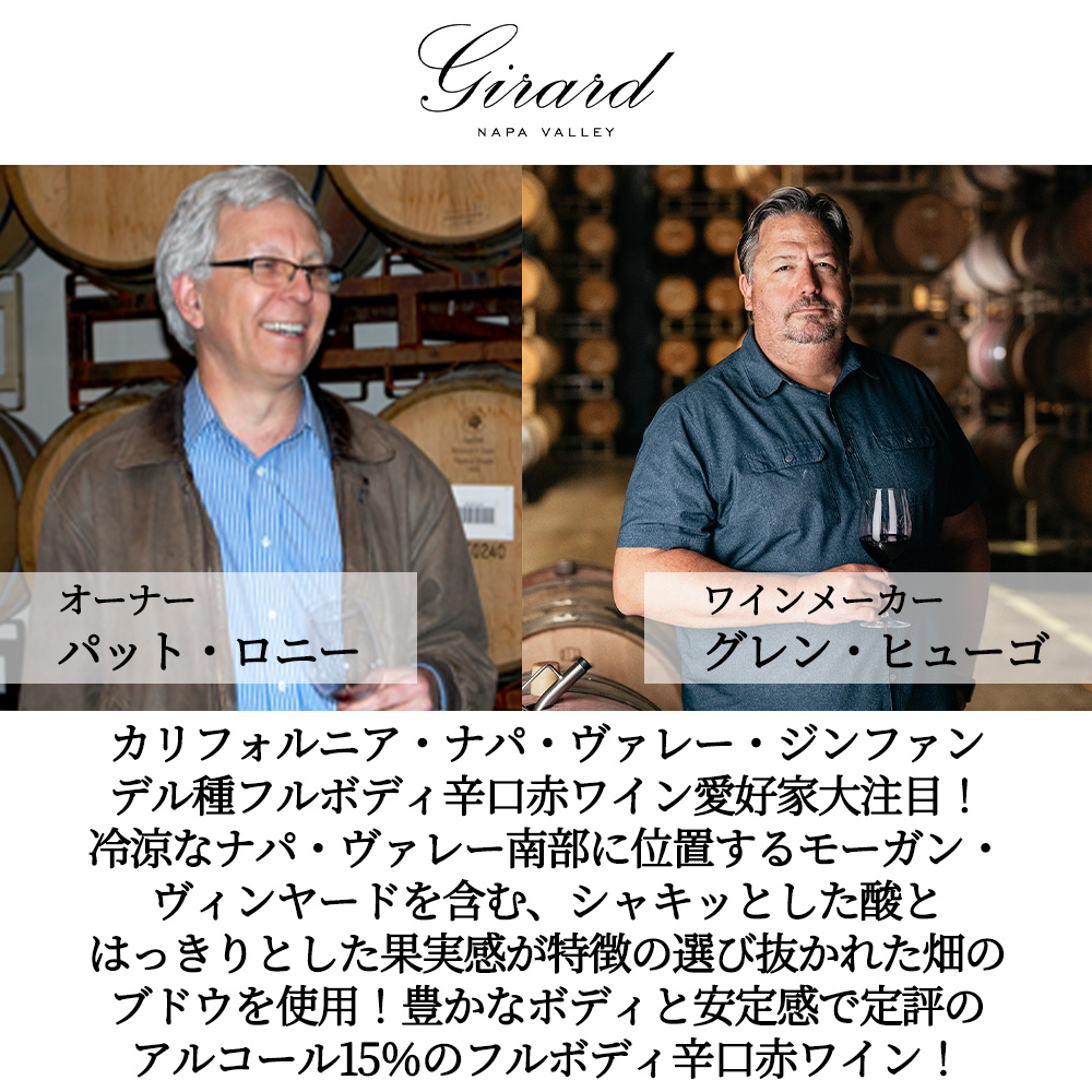 【商品説明】カリフォルニア・ナパ・ヴァレーフルボディ辛口赤ワイン愛好家大注目!ナパヴァレー・ジンファンデル種フルボディ辛口赤ワイン愛好家大注目!豊かなボディと安定感!「カルトワインの巣窟」ナパヴァレーのプリチャード・ヒル地区!冷涼なナパ・ヴァレー南部に位置するモーガン・ヴィンヤードを含む、シャキッとした酸とはっきりとした果実感が特徴の選び抜かれた畑のブドウを使用しています!また古樹があるカリストガのグッドワード・ヴィンヤードのブドウも、深い風味と洗練された味わいのワインに仕上がる鍵となっています!また、米・仏・ハンガリー産の樽材を組み合わせて小樽を作る「フュージョン・バレル」も使用! 造り手はナパの老舗ワイナリーをパット・ロニー (元ソムリエでありシャトー・セントジーン (Chateau St. Jean ) の社長を歴任&「ワイン・オブ・ザ・イヤー」獲得&あのDean & Deluca の経営にも参加) が2000 年に引き継いでから、現在のジラード・ワイナリーの歴史が始まりました!オーナーであるパット・ロニーのキャリアは、シカゴにあった伝説のレストラン「パンプ・ルーム」のソムリエに始まりました!その後、出身地であるカリフォルニアに戻りワイナリーで働き、最終的にはシャトー・セント・ジーンの社長にまで上り詰めました!またDean & Deluca の経営にも参加するなど食文化に精通した彼が、新しい世紀に入って始めたワイナリーがこのジラード・ワイナリーです! (ジラードの創業者であるパット・ロニー氏とは、全米屈指の有名レストラン、シカゴの「ザ・パンプ・ルーム (The Pump Room) 」にてシェフ・ソムリエを務めていた人物です。やがて氏は、故郷のカリフォルニアへ戻り、1999年に「ワイン・オブ・ザ・イヤー」を戴冠されることとなるシャトー・セントジーン (Chateau St. Jean ) の社長を歴任。その後、自らのワイナリーを興すに至ります。ジラードでの彼が、あえて周囲の相場を無視したような価格に徹する理由は、自身の原体験から。「費用対効果に秀でるワインを、一人でも多くの方に飲んでもらう事こそが最も大切。」との考えに起因するものです。) パットの人脈を生かし、自社畑をはじめナパ・ヴァレーのヴァレーフロアから山岳地帯まで、幅広いレンジの銘醸畑から高品質のブドウを調達し、それらのブドウから多様性あるナパ・ヴァレーの本質を表現するワインを造っています!カベルネ・ソーヴィニョンはもちろんのこと、マルベックやプティット・シラーの単一品種ワインや、高樹齢のジンファンデルまで、個性あふれるワインを造っています! パットと同じレストラン業界から転身したグレン・ヒューゴは、ジラードのハーベスト・インターンから始まりワインメーカーになった人物です!現在は次々と新しい事にチャレンジし、昔ナパでも造られていたというローヌ系品種のフィールドブレンドを復活させたり、米・仏・ハンガリー産の樽材を組み合わせて小樽を作る「フュージョン・バレル」 (「フュージョン・バレル」は、ジラードでの樽熟成には欠かせないものとなりつつあります。ワールド・クーパリッジ社がワイン醸造家特定のスペックに合わせて製造するカスタムデザインの樽で、異なる種類のオーク材を組み合わせて 1 つの樽を造り、ワインに好みの複雑味とニュアンスを与える特別な樽なのです。) を樽メーカーと開発したり、様々なプロジェクトに取り組んでいます! また、2018年に完成したカリストガのワイナリーでは独自のグリーン・プログラムを導入し、太陽光パネルでワイナリーで使用する95%の電力をまかない、夜間の冷気を利用したセラーのクーリングシステムを採用し、また、気候変動による干ばつ問題が深刻になりつつある中、水の再利用や最低限の水で樽を洗浄できるマシンの導入など、あらゆる分野でサステイナブルなプログラムを実践し、将来の世代に繋がるワイン造りを目指しています! このジラード・オールド・ヴァイン・ジンファンデル・ナパ・ヴァレー[2022]年・ジラードワイナリーでジェイムスサックリング驚異の92点獲得!絶賛コメントは『豪華なラズベリーとブラックベリーの香りが、この滑らかでフルボディのワインにおける熟した親しみやすい黒い果実の味わいへと導きます。チョコレート、グレープジャム、バニラビーンズ、クレーム・ド・カシスが口の中に広がります。タンニンは控えめ。今すぐお飲みいただけます。92点』と大注目! ジラード・ナパ・オールド・ヴァイン・ジンファンデルは、ラズベリーとチェリーの鮮やかな香りを、豊かな温かみのあるスパイスとバニラビーンズの層でバランスよく示します!口に含むと豊かで表現力があり、明るい果実味と生き生きとした酸味が支え、洗練された余韻へと続きます!ナパのオールド・ヴァインの遺産を際立たせる、力強くもエレガントなジンファンデルです!もちろん正規品の素晴らしい状態で限定入荷!