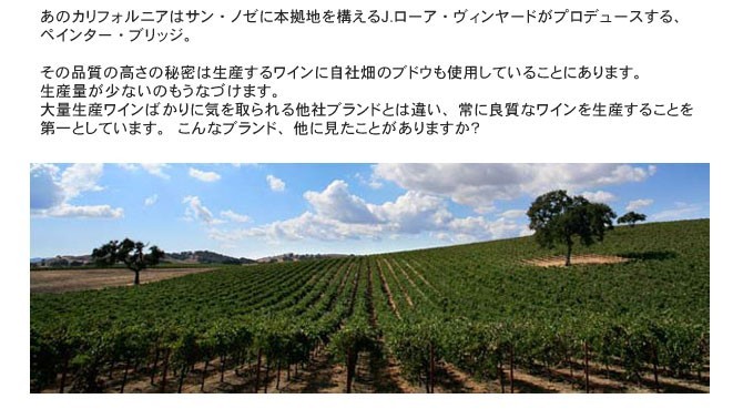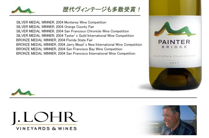 | ■生産者について | あのカリフォルニアはサン・ノゼに本拠地を構えるJ.ローア・ヴィンヤードがプロデュースする、ペインター・ブリッジ。その品質の高さの秘密は生産するワインに自社畑のブドウも使用していることにあります。生産量が少ないのもうなづけます。 大量生産ワインばかりに気を取られる他社ブランドとは違い、常に良質なワインを生産することを第一としています。 こんなブランド、他に見たことがありますか? |