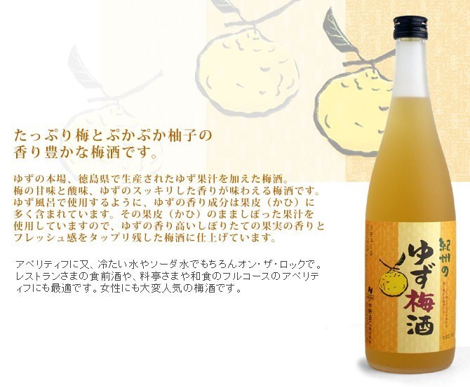 | ゆずの本場、徳島県で生産されたゆず果汁を加えた梅酒。梅の甘味と酸味、ゆずのスッキリした香りが味わえる梅酒です。ゆず風呂で使用するように、ゆずの香り成分は果皮(かひ)に多く含まれています。その果皮(かひ)のまま しぼった果汁を使用していますので、ゆずの香り高いしぼりたての果実の香りとフレッシュ感をタップリ残した梅酒に仕上げています。アペリティフに又、冷たい水やソーダ水でもちろんオン・ザ・ロックで。レストランさまの食前酒や、料亭さまや和食のフルコースのアペリティフにも最適です。女性にも大変人気の梅酒です。 |