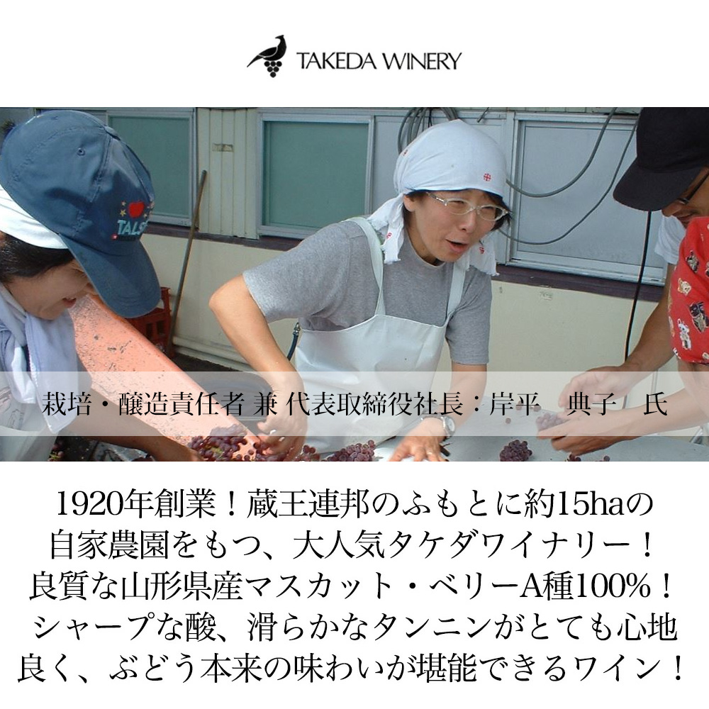 【商品説明】日本ワイン愛好家大注目!山形県産ベリーA種100%使用赤ワイン愛好家大注目! 造り手は蔵王連峰のふもと、山形県かみのやま温泉からほど遠くない、東南斜面に約15ヘクタールにおよぶ自家農園をもつ、タケダワイナリー!(タケダワイナリーは、蔵王連峰のふもと、山形県かみのやま温泉郷よりほど遠くない南向きの高台に位置しております。)1920年(大正9年)武田家が果実酒醸造免許を取得し、当時としては画期的なワイン(ブドー酒)を作り始めます!そのワイン工場はタケダワイナリーの前身となる「武田食品工場」という名前でした!上山市で代々、ぶどう栽培を行っていたこともあり、ワイン造りを開始します!以来、「良いワインは良いぶどうから」をモットーに土造りからはじめたぶどう栽培、ワイン醸造を続けています! このワインへのワイナリーからのコメントは『原料のマスカット・ベリーA種はデラウェア種とならび、山形県で生食用として多く栽培されている品種で、日本で品種改良されたものです。タケダワイナリーでは、協力農家さん(天童市の協力農家さん)としっかり連携をしながら、この品種を昔から大切な位置付けにし、かつ毎年新しいアプローチをしながらワイン造りをしています。 腐敗果がなくPH値も低い健全なぶどうであること、仕込み時の徹底した選果やワイナリー内の衛生管理、また、より自然な造りを心掛け、ワインメーカーが随時自身の目で確認し管理をするなど、手間の掛け方や造りのレベルはフラグシップのシャトー・タケダと遜色のないものです。赤い果実の香りとシャープな酸、滑らかなタンニンがとても心地良く、ぶどう本来の味わいが堪能できるワインです。ボトムレンジだからこそ、ワイナリーの真価が問われるものとし、力を注いでいる商品です。』 このタケダワイナリー・ルージュ(赤・辛口)[2024]年は、収穫したての良質な山形県産マスカット・ベリーA種を100%使用した、軽めの赤ワインです!果実の香り豊かで、シャープな酸味と滑らかなタンニンが心地良い、バランスのとれた味わいです。(赤い果実やキャラメルの甘やかな香立ち。山形のベーリーAらしいシャープな酸味と、滑らかなタンニンが心地よいバランスのとれた一本。ブドウ本来の味わいが堪能できるワインです。) 洋食はもちろんのこと、焼き肉や焼き鳥などのしょうゆやみりんを使ったお料理との相性も抜群です!