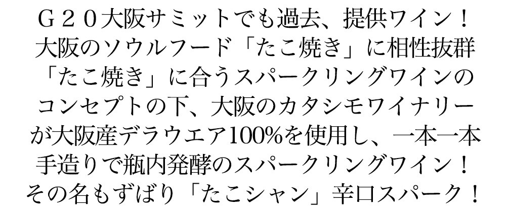 たこシャン[2023]年・カタシモワイナリー(泡・白)・過去VTG20大阪サミット提供ワイン!デラウェア種100%・日本ワイン・大阪柏原市(河内ワイン)・スパークリングワイン(瓶内発酵)