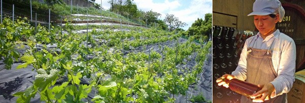 • カタシモワイナリーのある柏原市は大阪随一のブドウの産地で、太平寺地区は聖武天皇が東大寺大仏(廬舎那仏)造立を思い立つきっかけとなった智識寺があった場所です。ブドウ農家古民家が立ち並び歴史的風情を残します。急斜面にブドウ畑が広がり、展望台からはあべのハルカスを含む大阪の街並みと大和川を望むことができます。自社農園で減農薬・有機肥料栽培するブドウは大阪府からエコ農産品として認定されています。ワイナリーの貯蔵庫は大正時代に建てられたもので、国の有形文化財に登録されています。