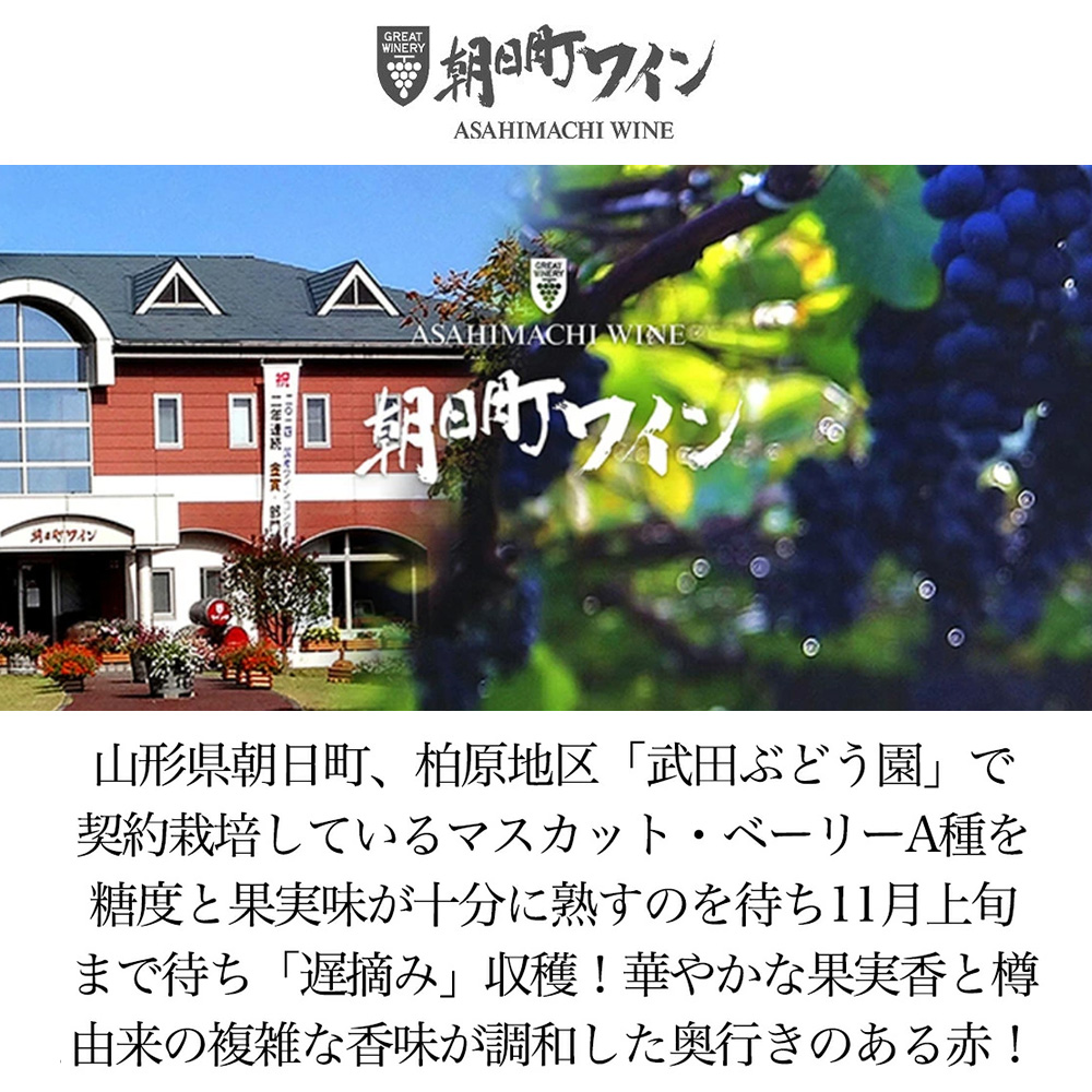 【商品説明】日本ワイン愛好家大注目!山形県朝日町、柏原地区「武田ぶどう園」で契約栽培しているマスカットベーリーA種を糖度と果実味が十分に熟すのを待ち、11月上旬まで待ち「遅摘み」収穫しました!マスカットベーリーA種の持つ特徴を引き出すために丁寧に醸造し、フランス産ワイン樽で11ヶ月間熟成した後、無濾過・非加熱にてビン詰め致しました!マスカットベーリーAの華やかな果実香と樽由来の複雑な香味が調和した、きめ細やかで奥行きのある赤ワインです!「遅摘み」収穫して醸造!華やかな果実香と樽由来の複雑な香味が調和した、奥行きのある赤ワイン!
