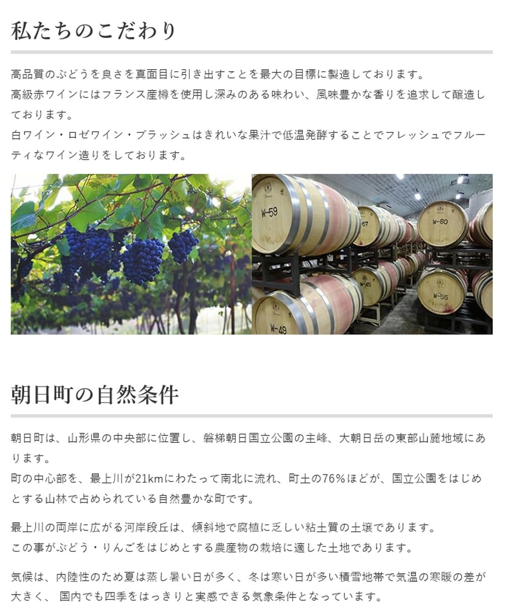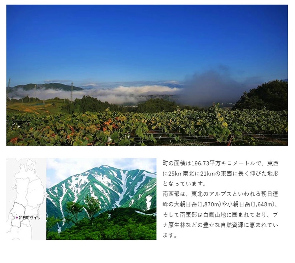 ![]() 高品質のぶどうを良さを真面目に引き出すことを最大の目標に製造しております。高級赤ワインにはフランス産樽を使用し深みのある味わい、風味豊かな香りを追求して醸造しております。白ワイン・ロゼワイン・ブラッシュはきれいな果汁で低温発酵することでフレッシュでフルーティなワイン造りをしております。 ![]() 朝日町は、山形県の中央部に位置し、磐梯朝日国立公園の主峰、大朝日岳の東部山麓地域にあります。町の中心部を、最上川が21kmにわたって南北に流れ、町土の76%ほどが、国立公園をはじめとする山林で占められている自然豊かな町です。最上川の両岸に広がる河岸段丘は、傾斜地で腐植に乏しい粘土質の土壌であります。この事がぶどう・りんごをはじめとする農産物の栽培に適した土地であります。 気候は、内陸性のため夏は蒸し暑い日が多く、冬は寒い日が多い積雪地帯で気温の寒暖の差が大きく、 国内でも四季をはっきりと実感できる気象条件となっています。 ![]() 町の面積は196.73平方キロメートルで、東西に25km南北に21kmの東西に長く伸びた地形となっています。南西部は、東北のアルプスといわれる朝日連峰の大朝日岳(1,870m)や小朝日岳(1,648m)、そして南東部は白鷹山地に囲まれており、ブナ原生林などの豊かな自然資源に恵まれています。 |