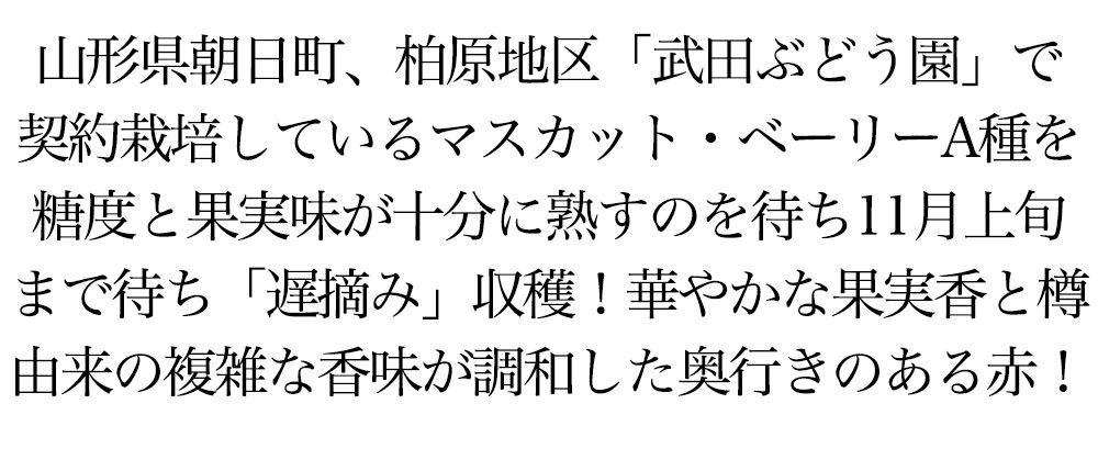 ![]() 朝日町ワイン・マイスターセレクション・遅摘みマスカットベーリーA[2022]年 ■葡萄品種:マスカットベーリーA種100% ■熟成:11ヶ月間 山形県朝日町、柏原地区「武田ぶどう園」で契約栽培しているマスカットベーリーA種を糖度と果実味が十分に熟すのを待ち、11月上旬まで待ち「遅摘み」収穫しました。 マスカットベーリーA種の持つ特徴を引き出すために丁寧に醸造し、フランス産ワイン樽で11ヶ月間熟成した後、無濾過・非加熱にてビン詰め。 マスカットベーリーAの華やかな果実香と樽由来の複雑な香味が調和した、きめ細やかで奥行きのある赤ワイン。 「遅摘み」収穫して醸造、華やかな果実香と樽由来の複雑な香味が調和した、奥行きのある赤ワインです! |