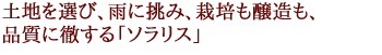 ■ 土地を選び、雨に挑み、栽培も醸造も、品質に徹する「ソラリス」 最高峰を目指すための、葡萄を育て上げるために、長野県の上田市や小諸市といった葡萄の栽培適地を選んで畑を拓き、年間雨量の多い日本で健全な葡萄を育成するために「マンズ・レインカット」を編み出し、年ごとに生育状況や天候を読みながら、細心の注意をはらいながら葡萄を育てます。