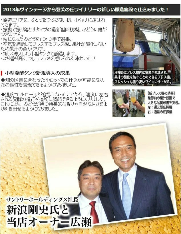 ![]() ![]() サントリー登美の丘ワイナリーは甲府の西北、山梨県甲斐市にある「登美の丘」に広大な自家葡萄園を有し、優れた醸造設備を備えた総合ワイナリー(ワイン醸造所)です。その全身となる「登美農園」の開園は1909年。以来100年にわたり「良いワインはよい葡萄から」というワインづくりの鉄則を守って、自らの手により土づくりから葡萄の実りを研究し、ワインの醸造・熟成にいたるすべてに地道な努力を重ねてきました。貴腐葡萄と貴腐ワインの誕生は、私どもの自家葡萄園ならではのその栽培・醸造技術の結晶であり、頂点を示すものであります。 ![]() ![]() ワイン専用葡萄は、一般に雨の少ない、日当たりのよい、一日の温度差が激しい気候を好みます。登美の丘は、葡萄王国、山梨の中でも最も雨の少ない土地に位置しており、畑が南向き斜面に広がっているため日当たりにも恵まれています。また、標高が高いため、冷涼で収穫期の昼夜の気温差が大きく、葡萄の熟度も高まります。いわば、ワインのための理想郷なのです。 ![]() ![]() 総面積150ha、9つの小さな丘が寄り添う大きな丘です。最も標高の高い見晴らし台園(600m)と麓の醸造所の間には約200mもの高低差があります。そして傾斜やカーブ、方角などによって畑の日照も異なり、バリエーションに富んだ地勢となっています。登美の丘では、これらの微気候の差や土壌の条件を考慮して、最適の場所に最適の葡萄品種を植えつけています。 |