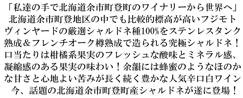【商品名】キャメルファーム ワイナリー シャルドネ フジモトヴィンヤード 2022 蔵出し品 キャメルファーム元詰 重厚ボトル 日本ワイン 白 辛口 750ml 【英名】Camel Farm Chardonnay Fujimoto Vineyard 2022 Chardonnay 100% Camel Farm Winery (Yoichi Hokkaido JAPAN) 【商品説明】日本ワイン愛好家大注目!北海道産高級シャルドネ100%辛口赤ワイン愛好家大注目!北海道余市町産100%のシャルドネ1種100%の白い花の蜜を想わせる甘い香りと黄桃やアプリコット、キャンディのような華やかでエレガントな香りの人気辛口白ワイン!「私たちの手で、北海道余市町登町のワイナリーから世界へ」東京から北へ約800km、北緯43度。4km北に日本海を望み、三方を山に囲まれ、山から海へ南北にまっすぐ貫く2つの川(余市川、登川)が開いた谷状の地形の土地にワイナリーがあります!総面積16.2ha!今から40年以上前からここでワイン用ぶどうを作ってきた藤本毅氏より技術と知恵を受け継ぎ、イタリアの伝統的製法と最新技術に見守られながら、世界的にも類をみないぶどうの樹が雪の下で冬を越す冷涼な土地のテロワールとぶどう品種の特徴を生かした日本ならではのワインを世界へ届けることを目指すキャメルファームワイナリー!品質の良さで高い評価を受け続けてきた藤本農園よりその技術と知恵を受け継ぎ2014年栽培をスタート!16haの畑にケルナー、バッカス、ブラウフレンキッシュ(レンベルガー)、ピノ・ノワール、レジェント、ツヴァイゲルト、アコロンを栽培!この栽培から醸造に至るまで、世界的醸造家であるリカルド・コタレッラ氏がコンサルタント!このキャメルファーム・ワイナリー・シャルドネ・フジモトヴィンヤード[2022]年シャルドネ100%のパーセルものは、北海道余市町登町産シャルドネ種100%を80%をステンレスタンク熟成&フレンチオーク樽100%で6ヶ月熟成(20%)で造られる究極辛口白ワイン!<醸造家からのコメント>は余市町登地区の中でも比較的標高が高いフジモトヴィンヤードで栽培されたシャルドネです。フジモトヴィンヤードのブドウ栽培に情熱と愛情、敬意を持って醸造しました。これまでの余市の歴史と伝統を最大限表現しながら、新しい醸造技術を用いることで今までにないスタイルのワインに仕上げました。<フジモトヴィンヤードシリーズ>2020年にスタートしたフジモトヴィンヤードはキャメルファームワイナリーの南の山側に位置しています。 西向き斜面の畑は夕日が長く照るため、果実味豊かなブドウが育ちます。美しく輝く淡い黄金色!白い花の蜜を想わせる甘い香りと黄桃やアプリコット、キャンディのような華やかでエレガントな香り!ミネラルやミント、エルダーフラワーの爽やかなアロマとほんの少しバニラのニュアンス!口当たりは柑橘系果実のフレッシュな酸味とミネラル感、凝縮感のある果実の味わい!バニラやナッツのニアンスもあり複雑さを感じ、余韻には蜂蜜のようなほのかな甘さと心地よい苦みが長く続く豊かな辛口白ワインです!今、話題の北海道余市町登町産シャルドネ100%<フジモトヴィンヤードシリーズ>辛口白ワインが限定で少量入荷! 【ワインのタイプ】白 辛口 【ワインのテイスト】 【生産者】キャメルファーム・ワイナリー・シャルドネ フジモトヴィンヤード 【生産地】日本/北海道/余市町登町 【生産年】[2022]年 【内容量】750ml 【ブドウの品種/セパージュ アッサンブラージュ】シャルドネ種100% 【注意文】 【商品番号】1900004003795