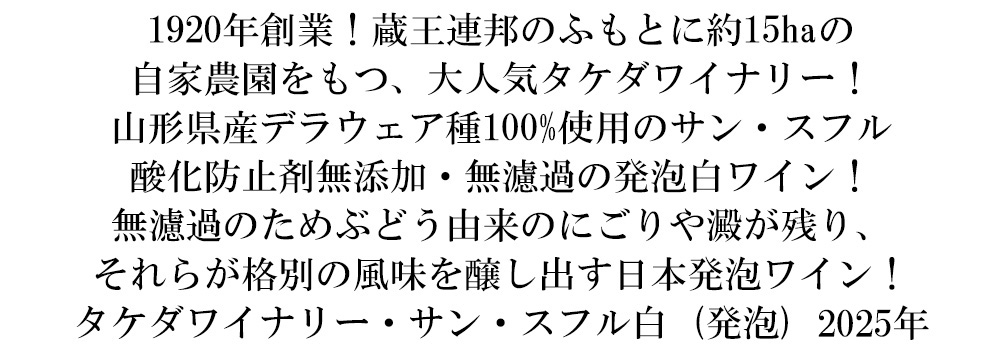 【商品名】タケダワイナリー サン スフル白(発泡)[2025]年 酸化防止剤無添加 無濾過 山形県産デラウェア ヴァンナチュール 瓶内発酵 【英名】TAKEDA WINERY Sans Soufre Blanc 2025 YAMAGATA GI【商品説明】日本ワイン愛好家大注目!山形県産デラウェア種100%使用で、サン・スフル・酸化防止剤無添加・無濾過の白ワイン(発泡)愛好家大注目!造り手は蔵王連峰のふもと、山形県かみのやま温泉からほど遠くない、東南斜面に約15ヘクタールにおよぶ自家農園をもつ、タケダワイナリー!このワイン・タケダワイナリー・サン・スフル白(発泡)山形県産デラウェア種100%[2025]年瓶内発酵(アンセストラル法)について生産者の説明は『このワインは、上山市近隣の協力農家が造った完熟したデラウェア種100%を使用しています。山形で栽培の盛んなデラウェア種、しっかり栽培・醸造したものには華やかな香りと奥行きがあります。亜硫酸を使用しない「サン・スフル」で醸造を行い、アンセストラル法により発泡ワインに仕上げました。アンセストラル法とは、発酵中のワインを瓶詰し、瓶の中で発酵を継続させることで、酵母が生んだガスがワインに溶け込み発泡ワインになることです。酵母が生んだきめ細やかな泡が、デラウェアのフレッシュな香りをますます引き立てています。また、ろ過をしないで瓶詰めすることでぶどう由来のにごりが残り、それが格別な風味となっています。(●補糖:なし●MLF:なし●樽熟成:なし●コラージュ:なし●ろ過:なし)』山形県産の完熟デラウェア種100%使用!発酵中のワインを瓶詰めし、瓶の中で発酵を継続させることで、酵母が生み出した炭酸ガスがワインに溶け込んだ発泡ワインです!無濾過のためぶどう由来のにごりや澱が残り、それらが格別の風味を醸し出します!酸化防止剤を使用せず、ろ過も行わない素直な味わいと、1本1本それぞれの瓶の中で育まれた、生き生きとした味わいをどうぞお楽しみください!【ご注意】開栓前はよく冷やし、瓶を振ったり、揺らしたりしないで下さい。瓶内のガス圧が高いので、泡や液体が噴き出します。流しの中などで、王冠部に手を添え、ガスを抜きながら少しづつ開け、収まったら王冠をはずしてください。無濾過ですので、葡萄由来のにごりや、酒石と呼ばれる結晶の塊がみられます。品質にはなんら問題はございません。ご安心して、お召し上がりください。 【ワインのタイプ】白 やや辛口 発泡 【ワインのテイスト】 【生産者】タケダ・ワイナリー 【生産地】日本ワイン/山形県上山市/ 【生産年】[2025]年 【内容量】750ml 【ブドウの品種/セパージュ アッサンブラージュ】デラウェア100% 【注意文】 【商品番号】1900004003900