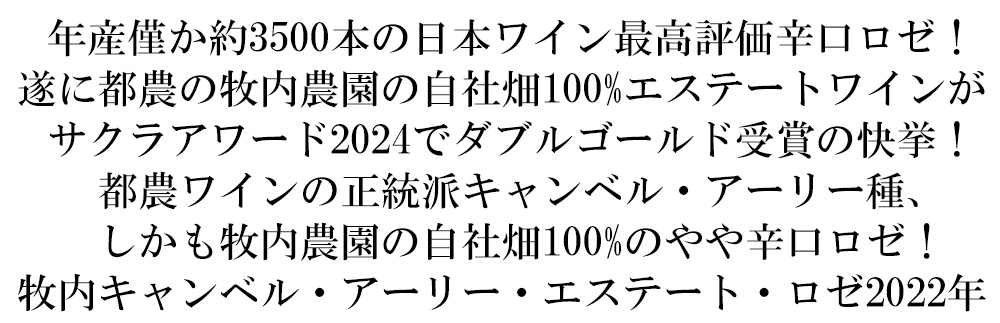 【商品名】牧内キャンベル アーリー エステート ロゼ 2022 年 都農ワイン元詰 牧内農園の自社畑100%のキャンベル アーリー種100%(宮崎県都農町) 「SAKURA Japan Women’s Wine Awards 2024(サクラアワード)」でDouble Gold ダブルゴールドメダル受賞(受賞数は全体の約6%)の快挙 日本ワイン やや辛口