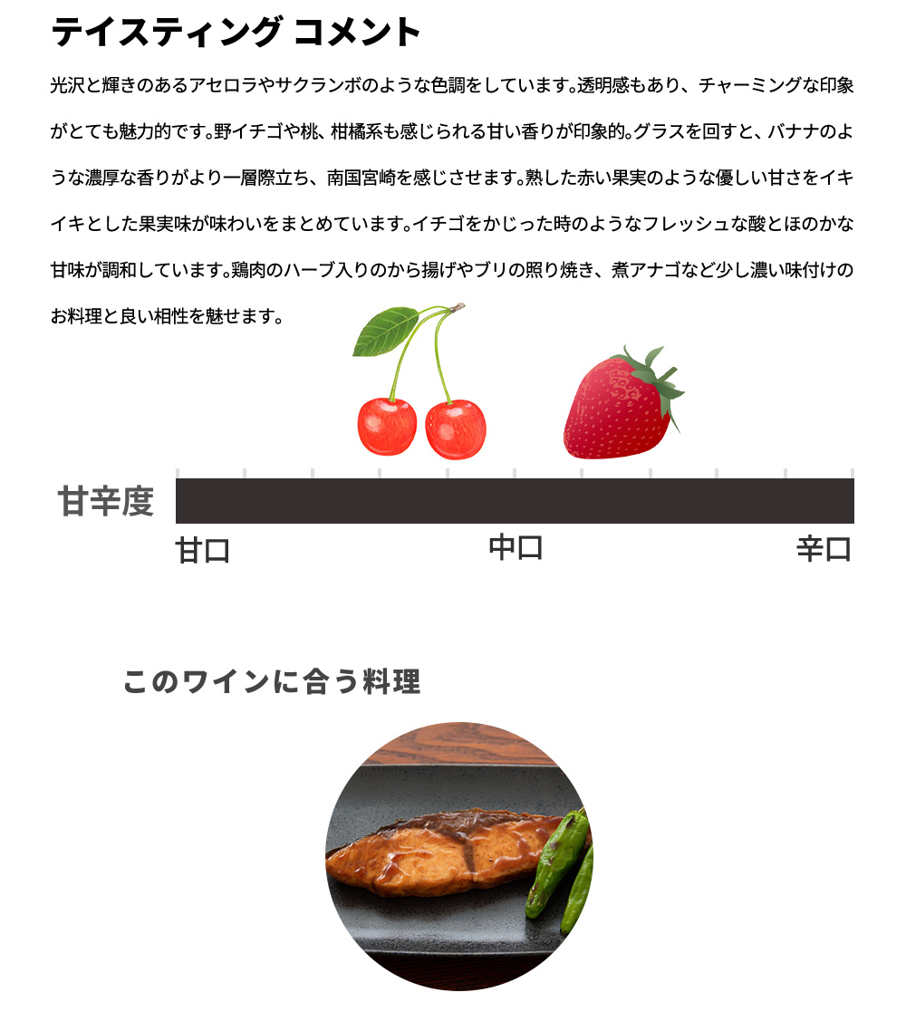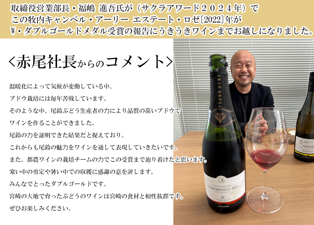 【商品説明】日本ワイン最高評価辛口ワイン愛好家大注目!ついに都農の牧内農園の自社畑100%エステートワインがダブルゴールド受賞の快挙!(これは全てのカテゴリーの中で、審査員の平均点が93点から100点のワインに与えられる賞。受賞数は全体の約6%))宮崎県都農町産自社畑100%純国産キャンベル・アーリー種100%辛口ロゼワイン愛好家大注目!自社農園(都農ワイン元詰 牧内農園の自社畑100%のキャンベル・アーリー種100%)で栽培した牧内キャンベル・アーリーのみを使用(標高200m、一文字短梢剪定、棚栽培、収穫2022年8月上旬~下旬収穫、ブラッシュ製法、低温醗酵、年産わずか約3500本のみ)!この受賞ワインについて都農ワインの醸造家の絶賛コメントは『光沢と輝きのあるアセロラやサクランボのような色調をしています。透明感もあり、チャーミングな印象がとても魅力的です。野イチゴや桃、柑橘系も感じられる甘い香りが印象的。グラスを回すと、バナナのような濃厚な香りがより一層際立ち、南国宮崎を感じさせます。熟した赤い果実のような優しい甘さをイキイキとした果実味が味わいをまとめています。イチゴをかじった時のようなフレッシュな酸とほのかな甘味が調和しています。鶏肉のハーブ入りのから揚げやブリの照り焼き、煮アナゴなど少し濃い味付けのお料理と良い相性を魅せます。飲み頃8℃~12℃』出来立てのフレッシュさも楽しめ、しばらく熟成させてからも楽しみなロゼワイン!しかも全世界的に爆発人気の辛口ロゼ!しかもサクラアワード「“SAKURA” Japan Women's Wine Awards 2024 」で見事Double Gold・ダブルゴールドメダルを受賞!(受賞数は全体の約6%)の快挙!都農ワインの正統派キャンベル・アーリー種、しかも牧内農園の自社畑100%のキャンベル・アーリー種100%のやや辛口ロゼ!日本ワイン愛好家大注目の都農(つの)ワインロゼが最高評価獲得で限定で少量入荷!