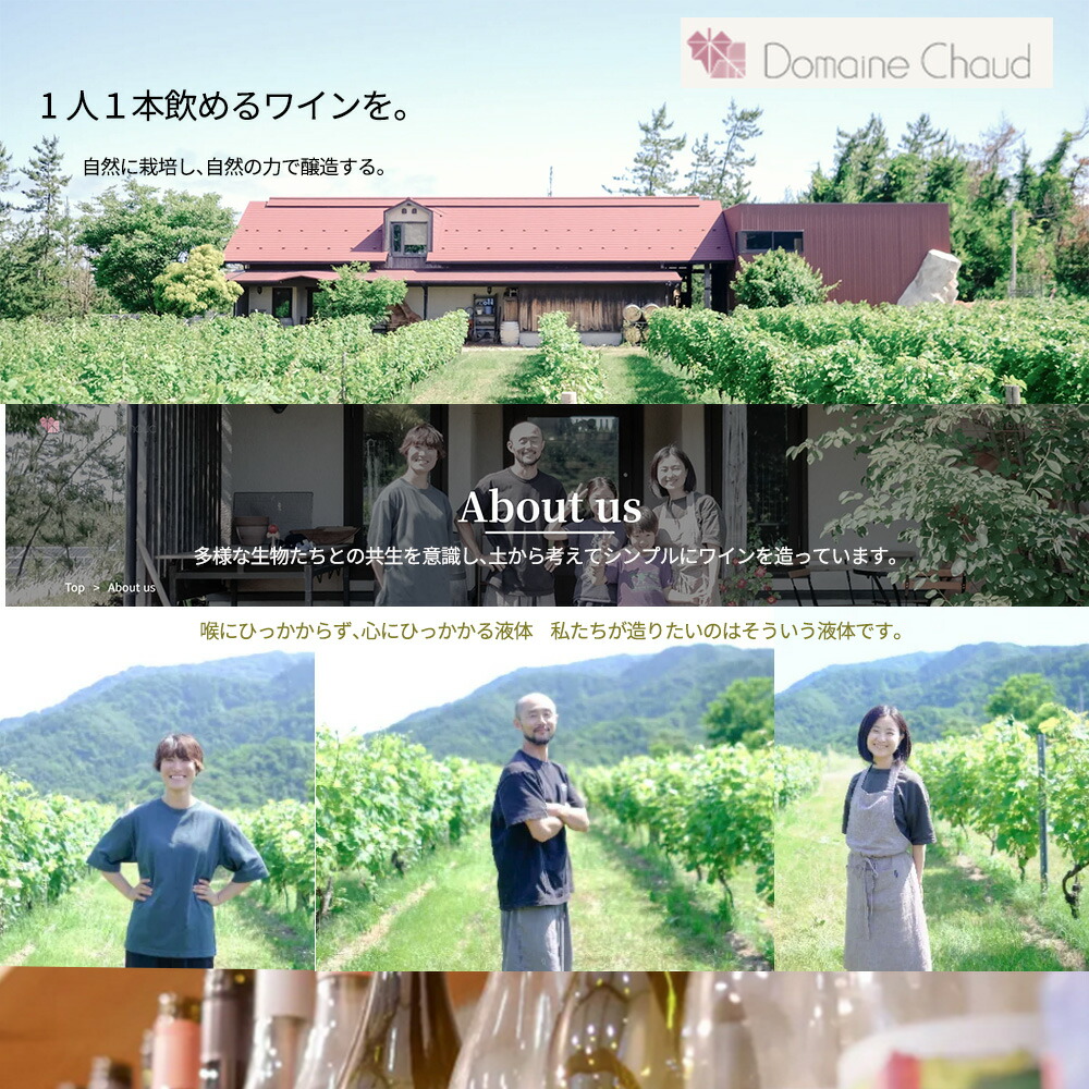 【ひとり1本、飲めるワインを。ドメーヌショオは新潟市の西海岸、角田山の麓に広がる砂地の土壌でぶどうの栽培、醸造を行う小さなワイナリーです。わたしたちが目指すのはひとり1本飲めるワイン!やさしく飲みやすい味わいだけどなんだかユニークでちょっと不思議…?また一杯、もう一杯と飲みたくなる喉に引っかからない、心に引っかかるワインをつくりたいです。ドメーヌショオは2011年に夫婦二人でスタートしたワイナリーです。私(小林英雄)は幼少期をドバイで過ごし、お酒好きな両親と世界各地を旅するうちにお酒に興味を抱きました。特に自然環境に大きく影響を受けるぶどうと微生物のはたらきによってできるワインに魅力を感じ、いつか自分の手でワインをつくりたいと思うようになりました。大学、大学院の博士課程で微生物の研究をし、卒業後はワイナリーの経営のためビジネスコンサルティング会社へ入社。あるプロジェクトで新潟に来た際カーブドッチと出会い、海が近く、幼いときから慣れ親しんだ砂の土地でワインづくりに挑戦することを決めました。ドメーヌショオの「ショオ」は小林の「小(ショウ)」から。またchaud(ショー)にはフランス語で熱い、あたたかいという意味があります。小さな私たちですが、熱い気持ちで、飲んだ人の心をあたたかくするワインをつくりたいと思っています。