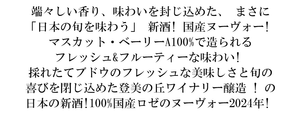 【商品名】日本の新酒 サントリー フロムファーム マスカット ベーリーA ロゼ 2024 新酒 山梨県産ブドウ100% 登美の丘ワイナリー醸造品 【英名】Suntory From Farm Nouveau Muscat Bailey A Rose [2024]【商品説明】入手困難!生産量極少量!ついに国産新酒(ヌーヴォー)入荷します!国産ロゼワイン愛好家大注目!完全数量限定品!100%国産の新酒(ヌーヴォー)2024年!厳選されたブドウを丁寧に手摘みし、瑞々しい香り、味わいを封じ込めた「日本の旬を味わう」新酒(国産ヌーヴォー)!日本固有品種“マスカットベーリーA”を使用した日本ワイン新酒です!造り手は、世界を感動させる“日本ワイン”を!日本ならではの“産地”と品種”の可能性を追求し、厳選した“国産ぶどう100%”のプレミアムワイン!サントリー日本ワインから新発売!~水と、土と、人と~がコンセプトの「フロムファーム」!日本固有品種は、日本の調味料との相性が抜群!欧州品種よりも鉄分が少ないため、魚の生臭さを発生させにくいため、魚介類と合わせやすく、和食と共に楽しめます!川上善兵衛が開発した品種(ベーリーとマスカット・ハンブルグの交配)マスカット・ベーリーA種で造られたロゼ!華やかで甘いベリー系の香り、ぶどうをほおばったようなフレッシュな甘さ、綺麗で可愛らしい色合いでカジュアルに楽しめる軽やかさが特長のロゼワインで、ワイン初心者でも飲みやすい味わいを目指しています!国産の新酒をこの機会にぜひ味わって下さい!新酒らしいフレッシュさを表現するために透明プリント瓶を採用!和食、高級料亭さまのヌーボーフェアのボトル売りにも最適です! 【ワインのタイプ】ロゼ・辛口 【ワインのテイスト】 【生産者】登美の丘ワイナリー 【生産地】日本/山梨 【生産年】[2024]年 【内容量】750ml 【ブドウの品種/セパージュ アッサンブラージュ】マスカット・ベーリーA種 【注意文】 【商品番号】1900004003788