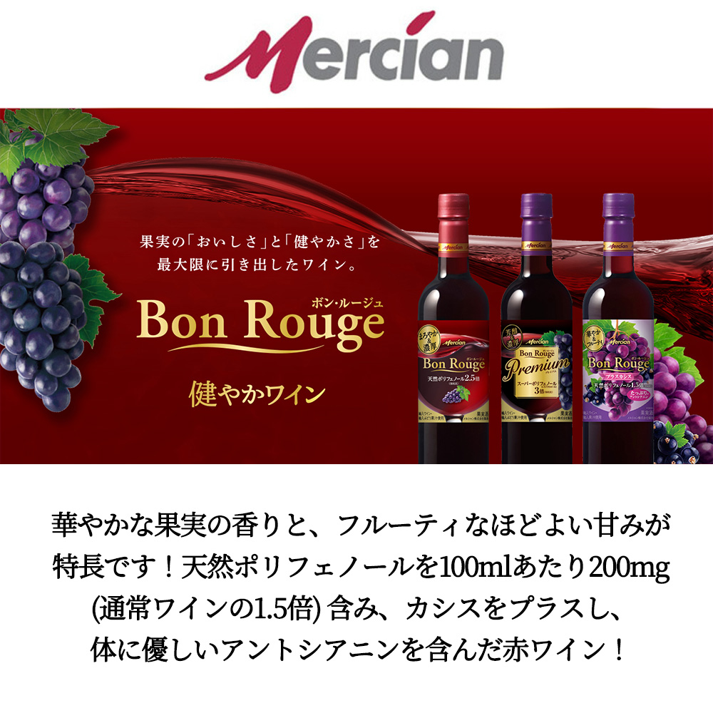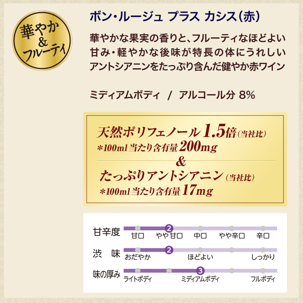 【商品説明】華やかな果実の香りと、フルーティなほどよい甘みが特長です。天然ポリフェノールを100mlあたり200mg※、通常ワインの1.5倍※含み、カシスをプラスし、体に優しいアントシアニンを含んだ赤ワインです。ワインの品質を守るコーティングを強化した『ワインのためのペットボトル』入りです。※当社比(製造時)